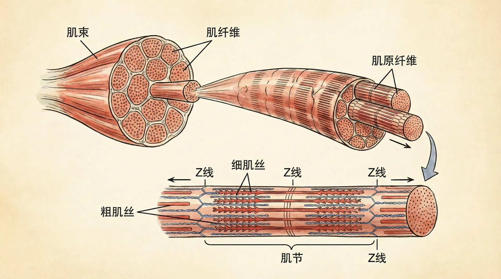 骨骼和关节只是运动的基础,真正让身体动起来的是肌肉。人体有600多块肌肉,它们占据了体重的40%左右。肌肉就像发动机,通过收缩和舒张产生力量,牵拉骨骼围绕关节转动,从而产生各种运动。