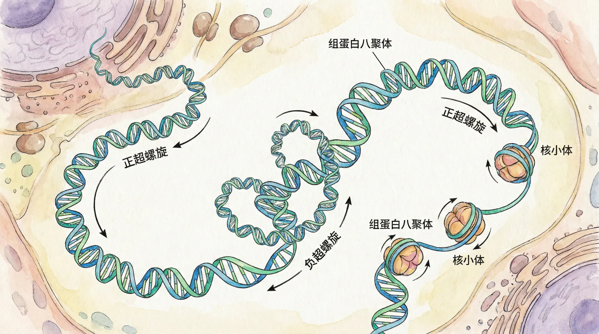 DNA的超螺旋是指DNA双螺旋轴本身再次扭曲形成的三级结构,这种结构让DNA分子在狭小的细胞空间内能够高效、有序地打包。例如,在原核生物如细菌中,几百万碱基对长度的DNA能被高度压缩后容纳在细胞质内,而在真核生物中,超螺旋还与核小体组装和染色质的更高级结构紧密相关。