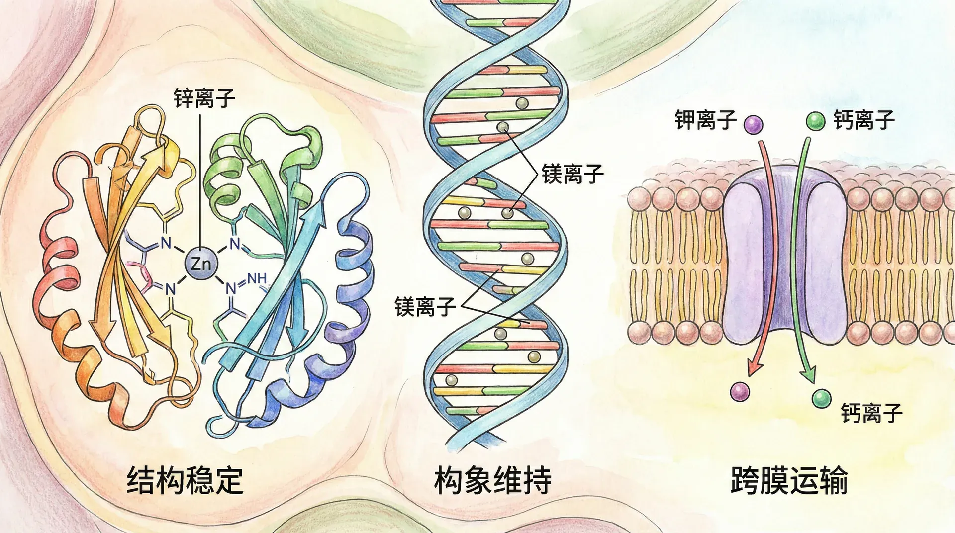 金属离子,尤其是二价阳离子,在核酸的结构组装与稳定方面不可替代。其中,镁离子(Mg²⁺)几乎参与所有RNA分子的天然折叠与催化活性过程。它通过与磷酸骨架和特定碱基的配位作用,屏蔽RNA主链的负电荷,促进复杂结构的收折、稳定发夹和假结构等关键空间构象。除Mg²⁺外,Ca²⁺、K⁺、Na⁺、Zn²⁺等离子分别以不同方式参与RNA折叠与功能调控。例如,Zn²⁺能够直接配位于G四链体或核糖体活性位点,调节分子识别和催化选择性。K⁺则在调节细胞内离子环境和支持特殊空间结构形成中扮演辅助角色。