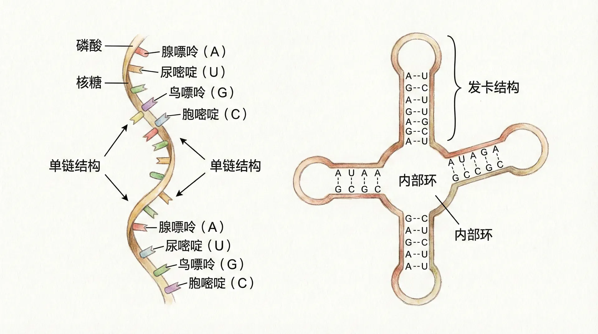 RNA分子内部不仅限于经典的Watson-Crick配对(A-U, G-C),还可形成多种非标准配对。例如: