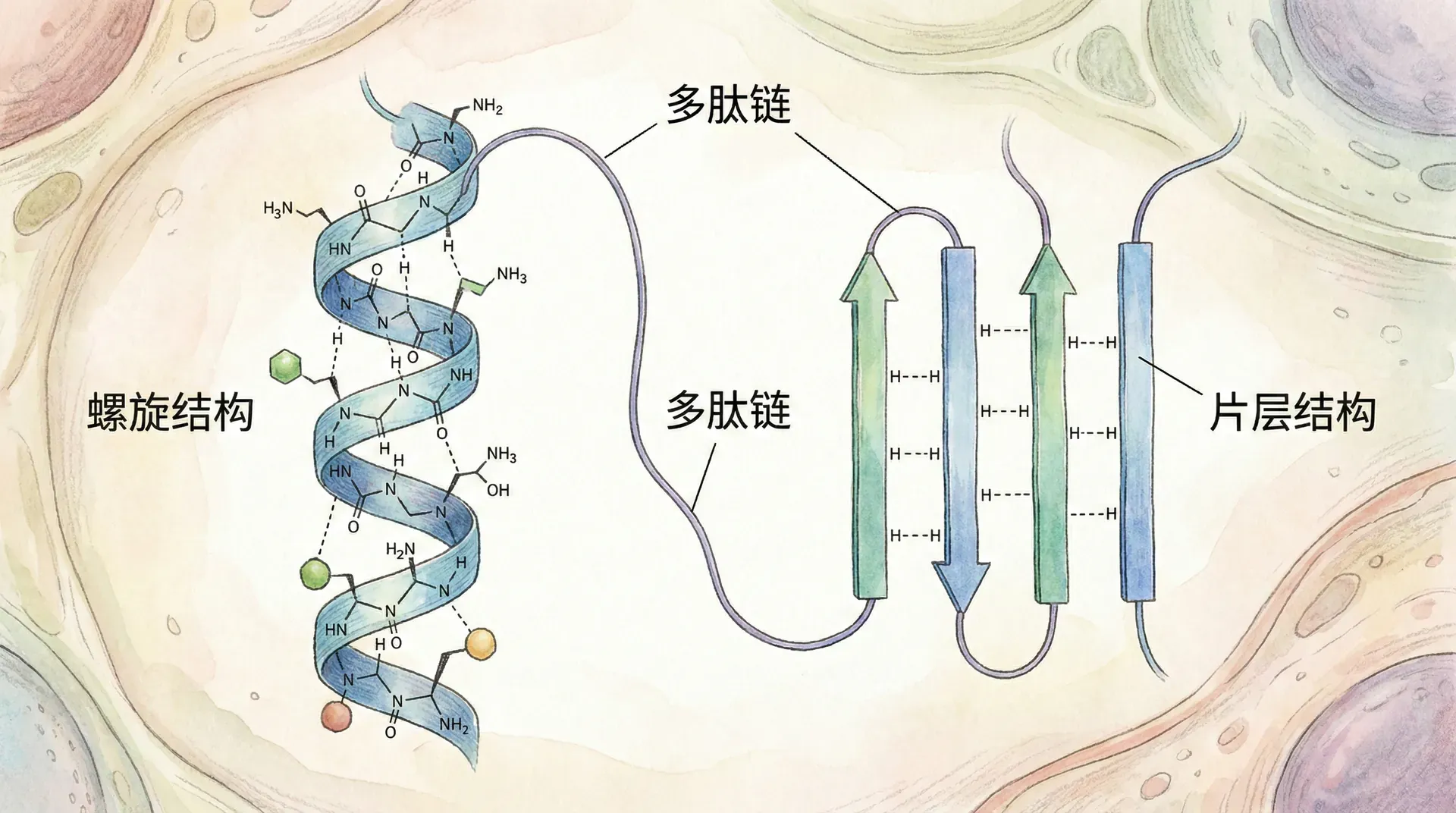 β折叠(β-pleated sheet)同样是常见的二级结构,与α螺旋不同,β折叠的肽链几乎完全平展,通过多条链段(β链,β-strand)排列形成片层,这些片层通过主链羰基氧和酰胺氢之间的氢键彼此连接。