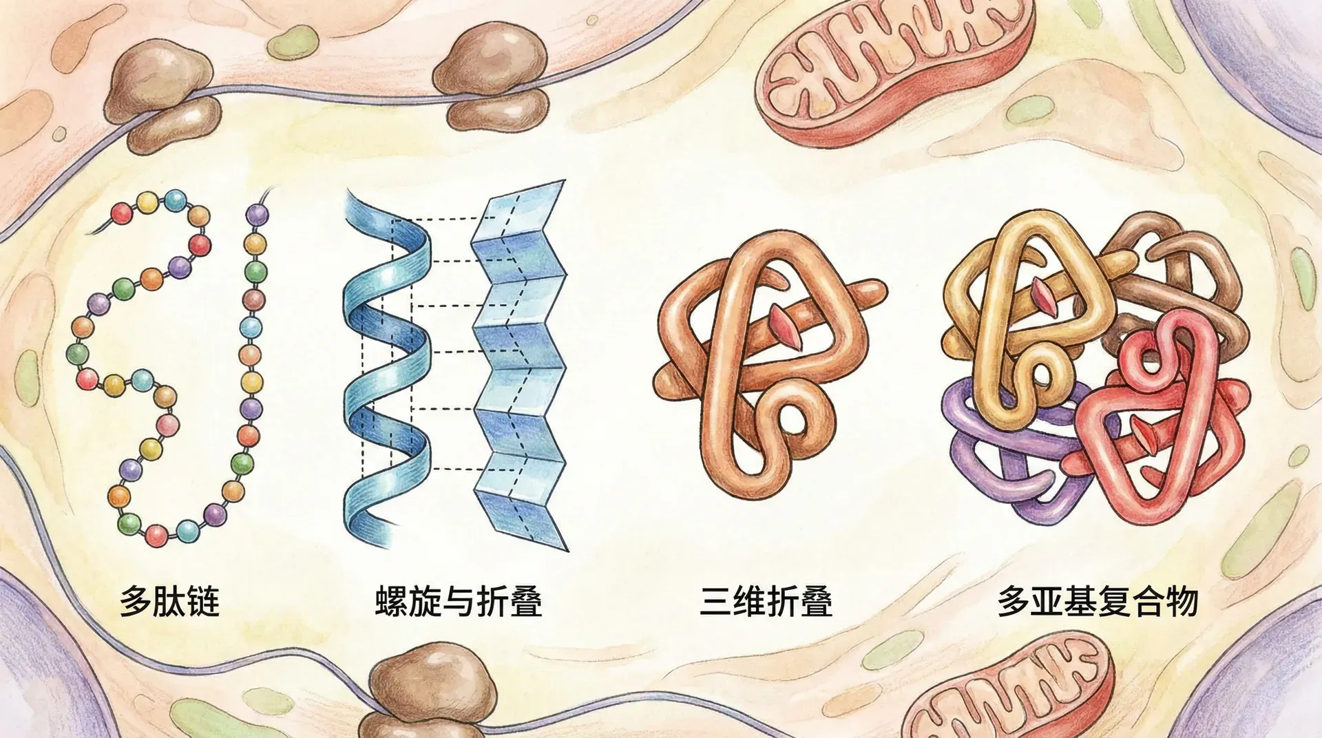 蛋白质分子的结构被分为四个层次:一级结构、二级结构、三级结构和四级结构。每一层次都是对前一层的进一步组织和折叠,每一步的变化都直接影响蛋白质的最终功能。可以将这种“层层递进”理解为中国传统建筑从单块砖瓦、木材,到各部分结构搭建,再最终呈现功能完整的居所。