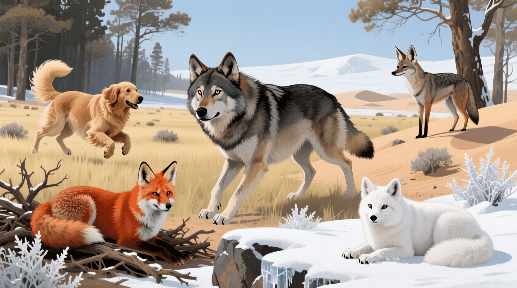 家犬、灰狼、郊狼都属于犬属,它们之间可以交配产生后代(虽然在自然界很少发生)。而狐狸虽然也是犬科,但属于不同的属,与狗的关系就远了一些。