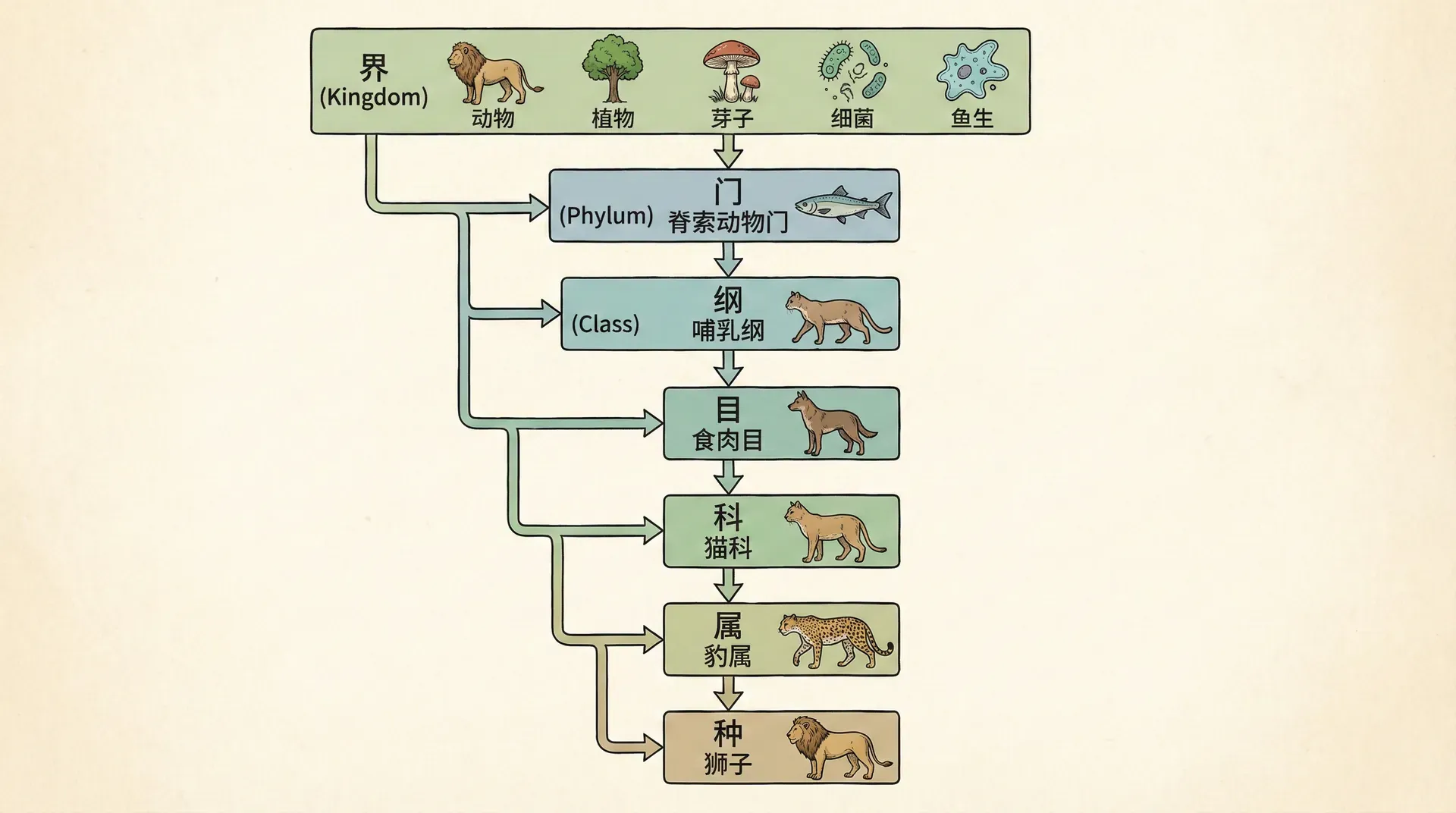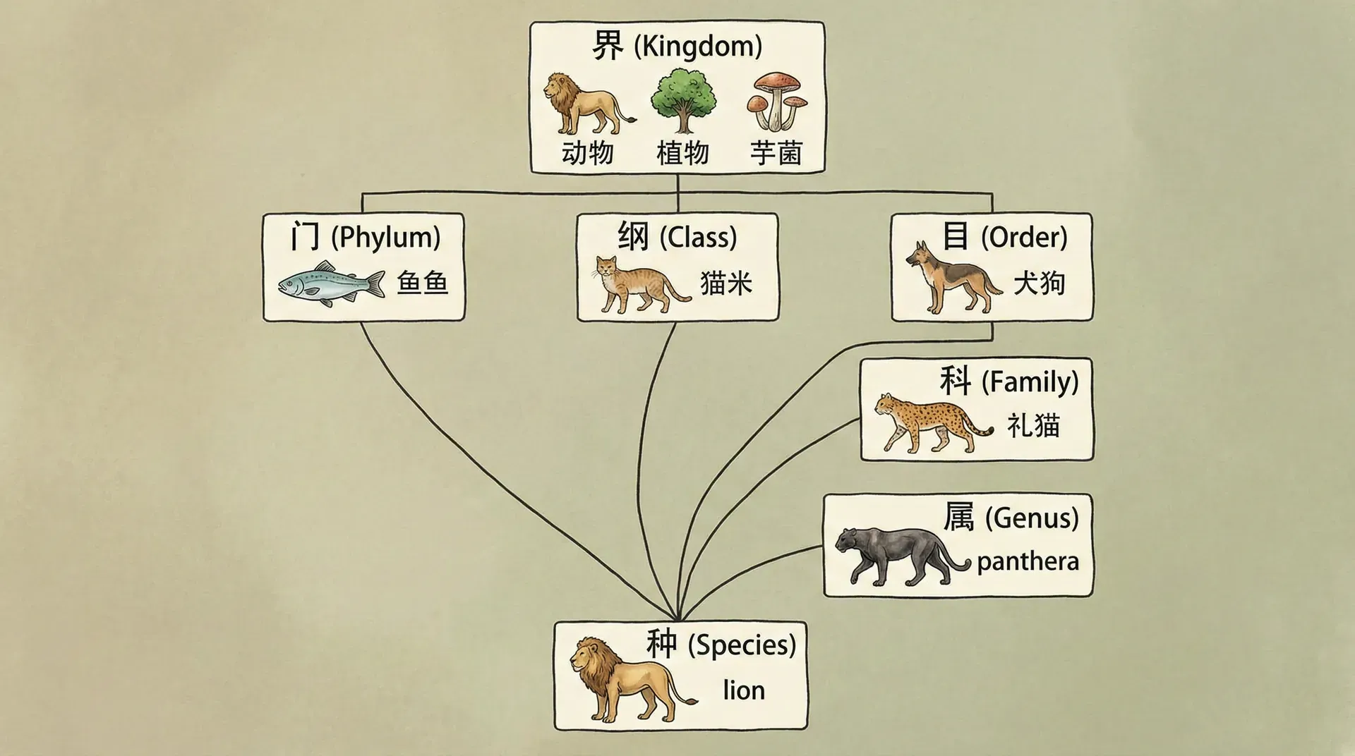这个层级系统就像一棵倒置的树。从树干(界)开始,分出几个大枝(门),大枝再分出中等的枝条(纲、目、科),最后分出细小的枝杈(属),树梢的每一片叶子就代表一个物种。