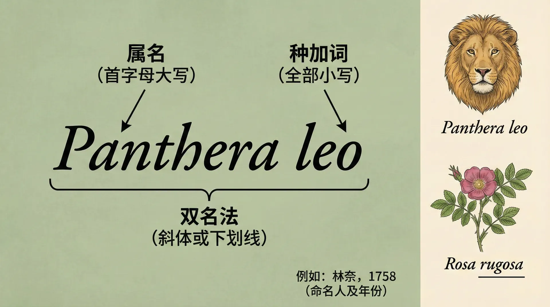 双名法的格式:属名 + 种名。属名首字母大写,种名全部小写,都用斜体表示。例如:Canis lupus(灰狼)。