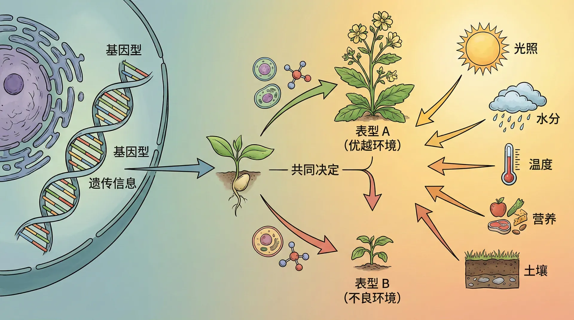 基因型是生物体的遗传蓝图,但表型是基因与环境共同作用的结果。同样的基因在不同环境中可能产生不同的表现,这就是基因表达的环境依赖性。