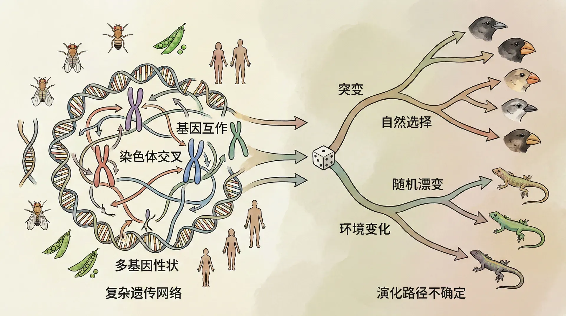 当我们理解了遗传的复杂性之后,一个更深层的问题浮现出来:生物是如何演化的?从简单的单细胞生物到复杂的多细胞生物,从海洋生物到陆地生物,从爬行动物到哺乳动物,这个漫长的过程是否有某种“方向”或“目的”?