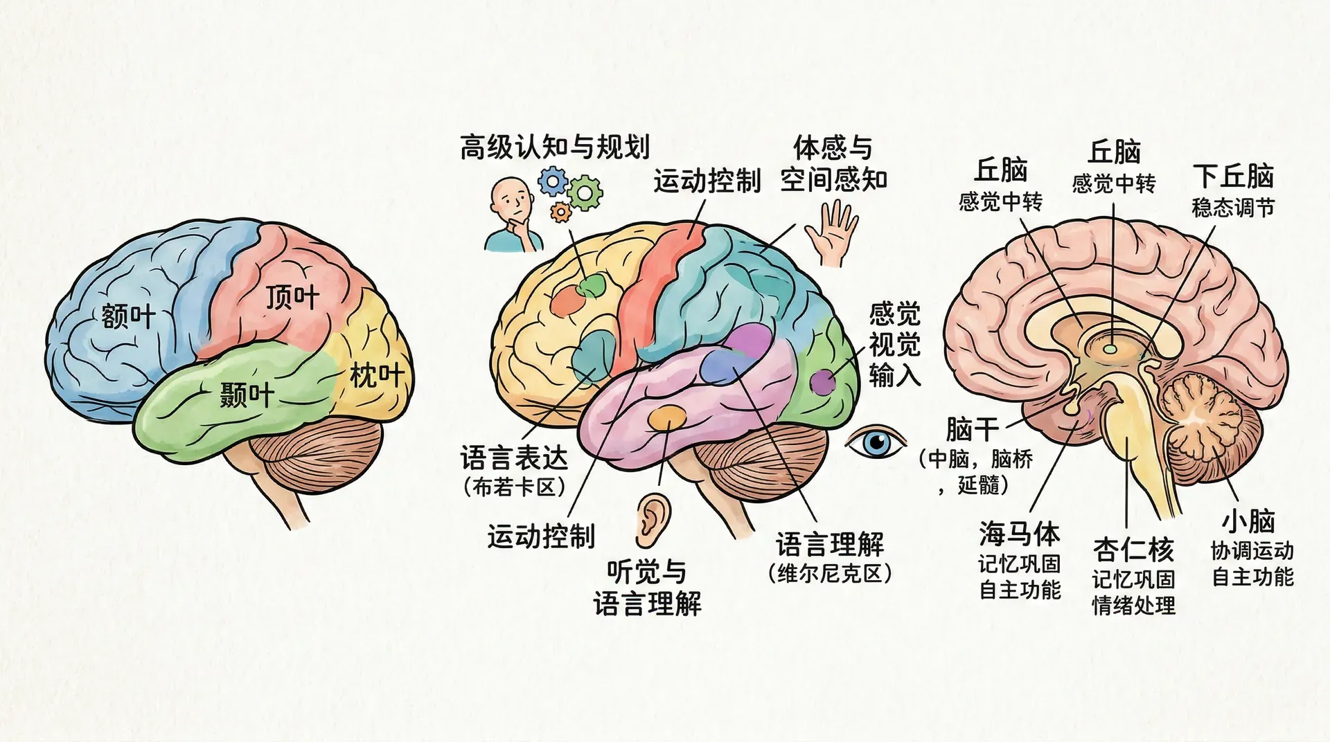 间脑深藏于大脑半球之下,主要包括丘脑和下丘脑。丘脑几乎是所有感觉信息(除嗅觉外)传入大脑皮层的“中转站”;下丘脑虽小,却是调节内脏活动、内分泌、体温与行为等的高级中枢。下丘脑能灵敏感知体温、血糖、血渗透压等内环境参数,并及时调节。