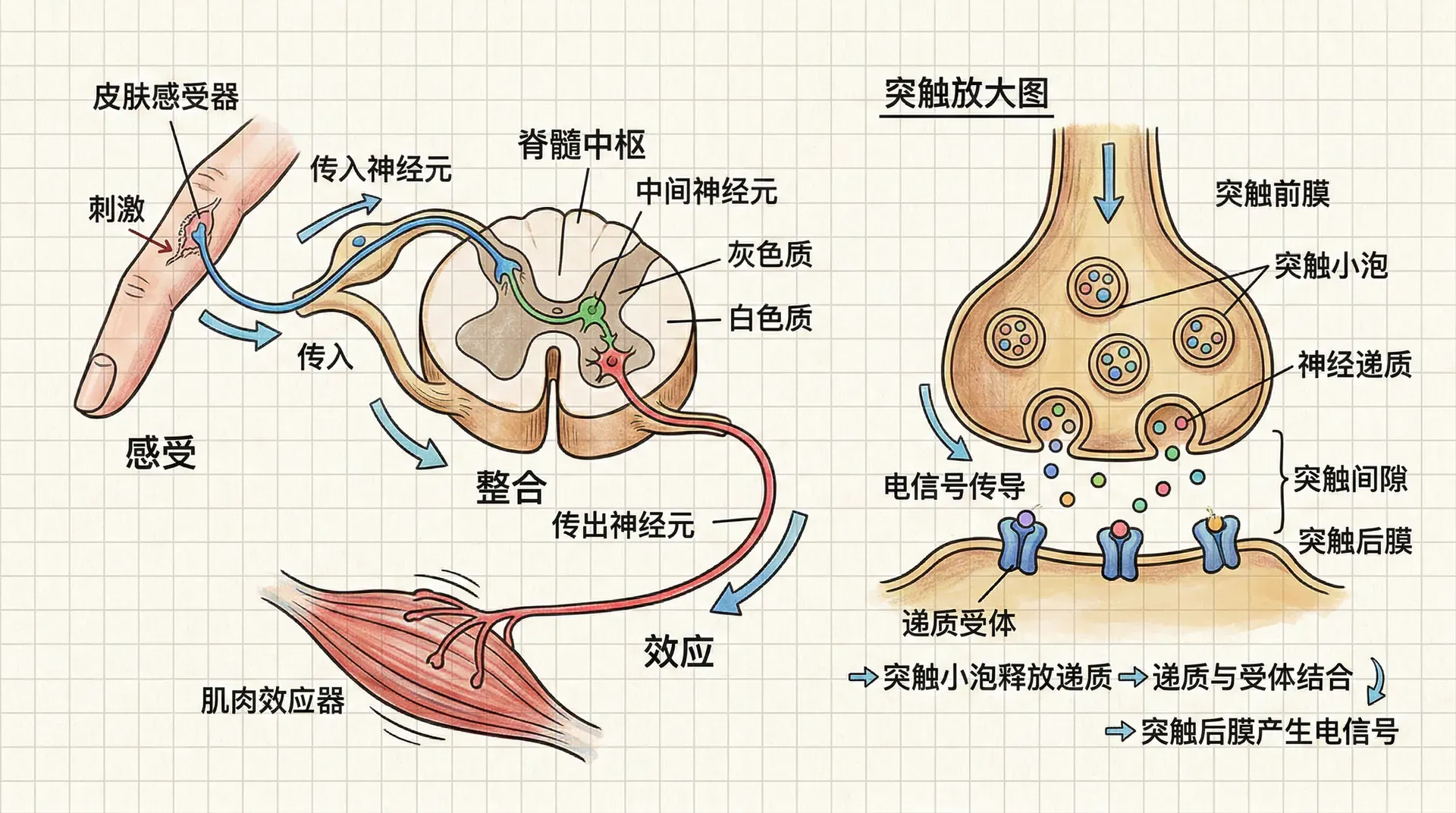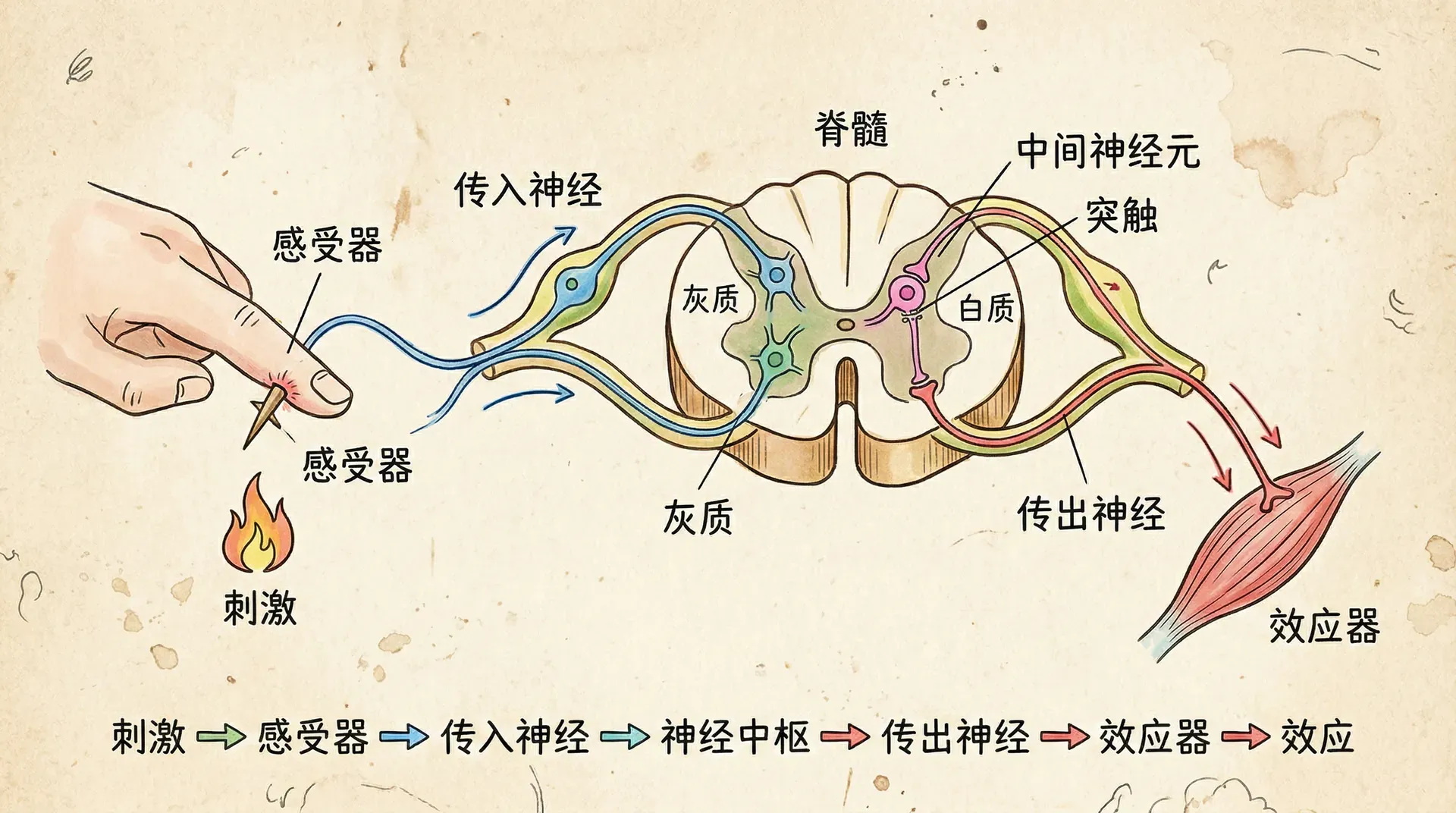 反射是神经系统最基本的活动方式,是机体对刺激产生的快速、不随意的反应。反射活动的结构基础是反射弧,它由五个基本部分组成,形成一个完整的信息传递链条。