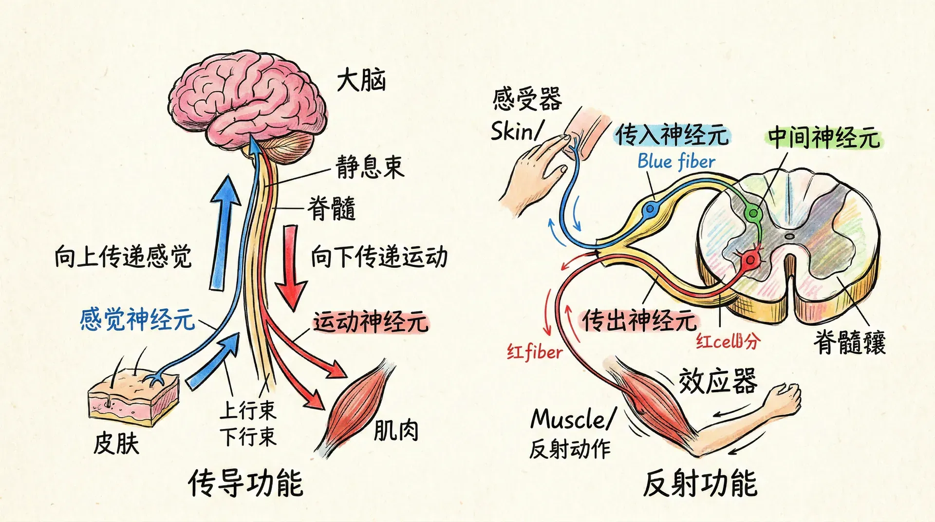 脊髓的传导功能体现在上行和下行两个方向。上行传导将来自躯体和内脏的感觉信息传向大脑,这些信息包括触觉、温度觉、痛觉、本体感觉等。不同的感觉信息通过不同的上行束传导,例如精细触觉和本体感觉主要通过脊髓后索传导,而痛温觉则主要通过脊髓丘脑束传导。这种分离传导的方式使得不同类型的感觉信息可以独立处理,提高了神经系统的信息处理效率。