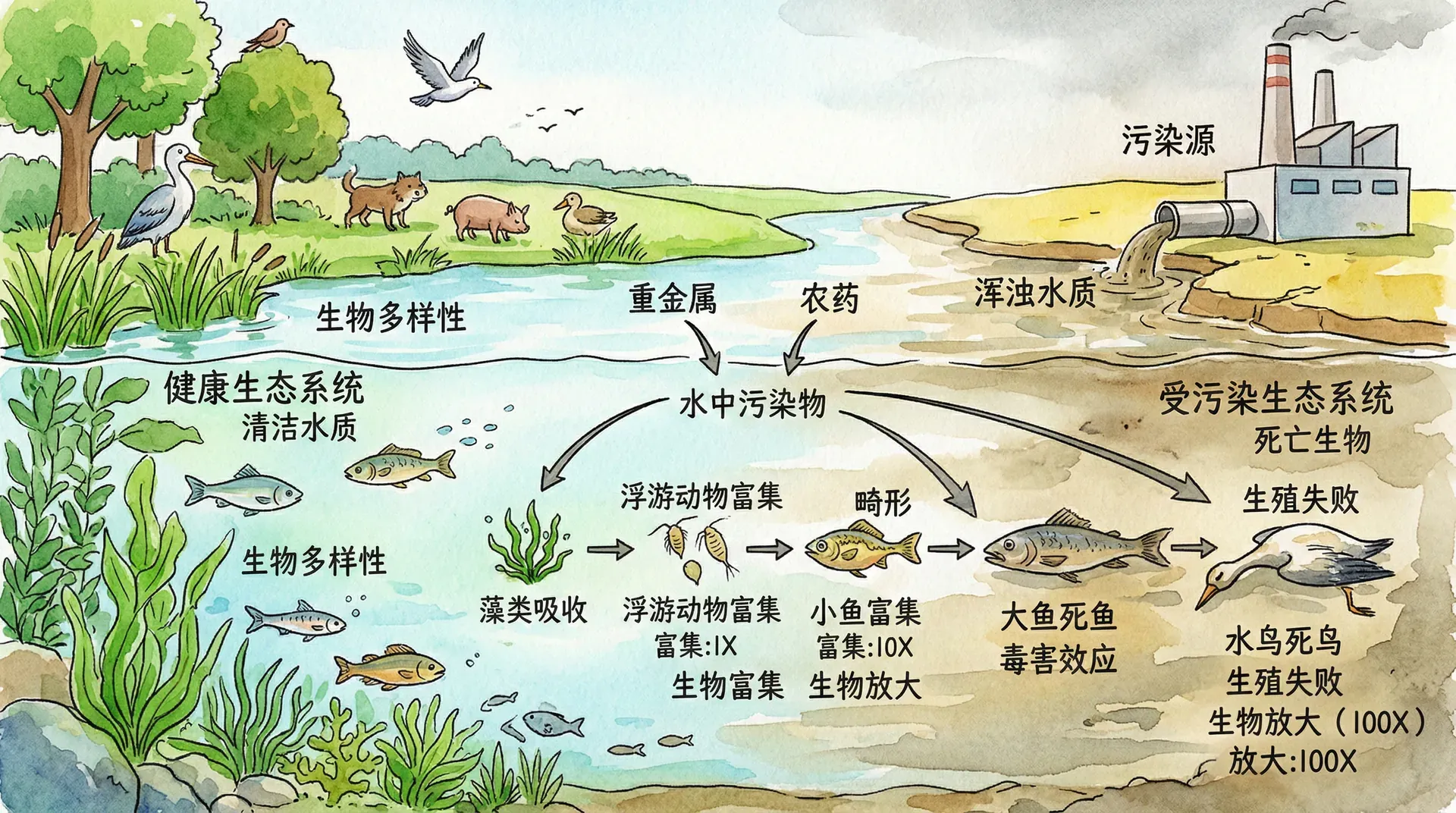 生物富集和生物放大是污染物在生态系统中积累的两个重要机制,它们使得环境中浓度很低的污染物在生物体内达到危险水平。