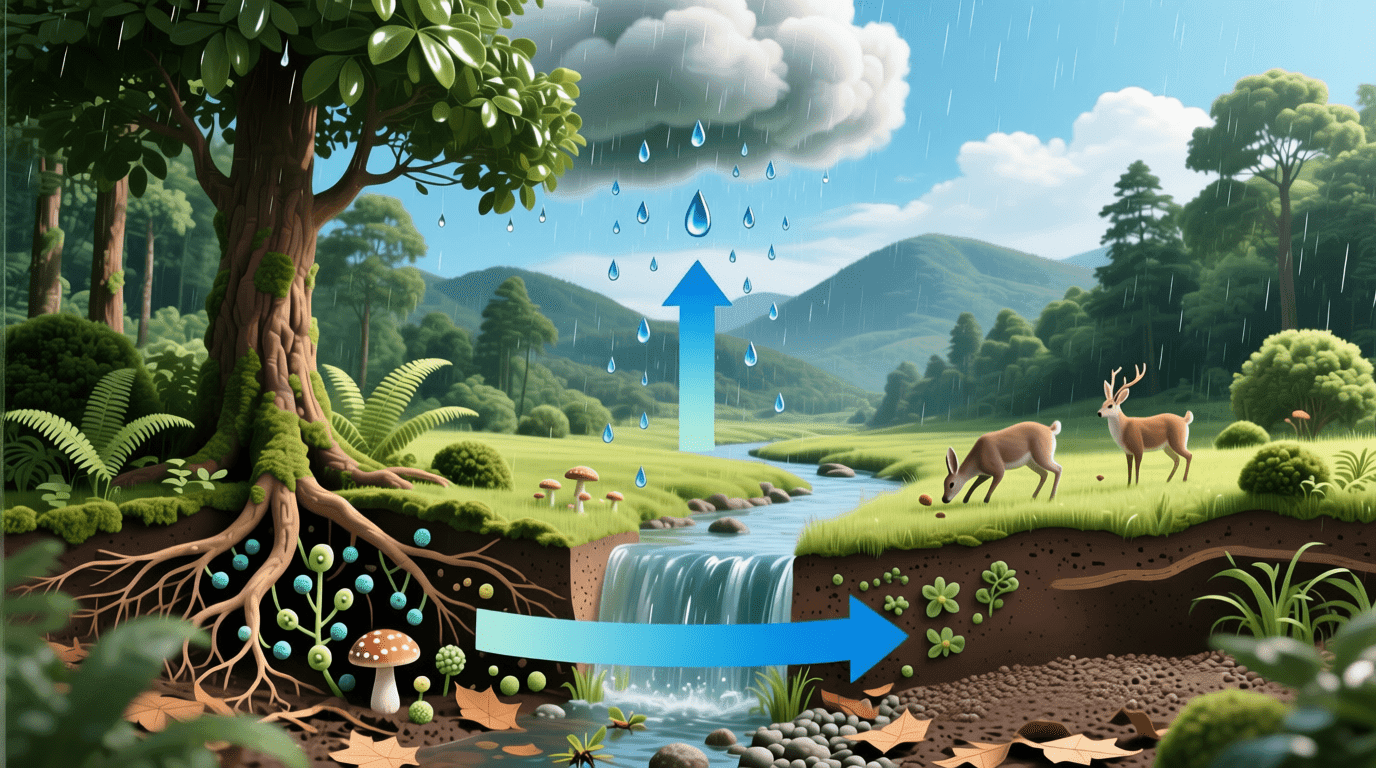 在一个完整的森林生态系统中,水的循环路径十分复杂。降雨落到林冠后,约20-30%被树叶截留并直接蒸发回大气,30-40%沿着树干流下或穿透林冠到达地面,其余部分渗入土壤。渗入土壤的水,一部分被植物根系吸收后通过蒸腾作用释放到大气,一部分通过土壤蒸发返回大气,还有一部分渗透到地下或以地表径流的形式流入河流。