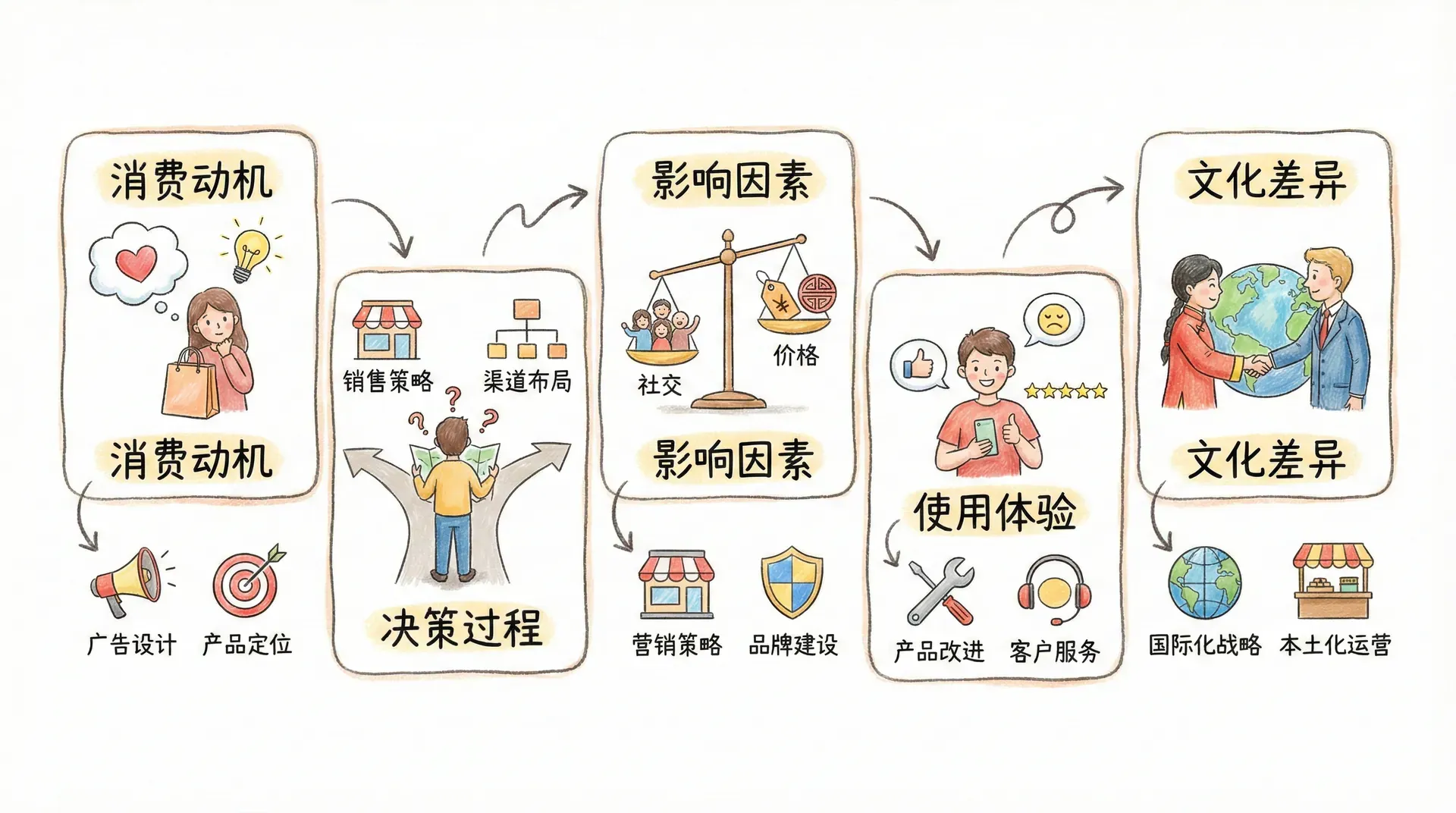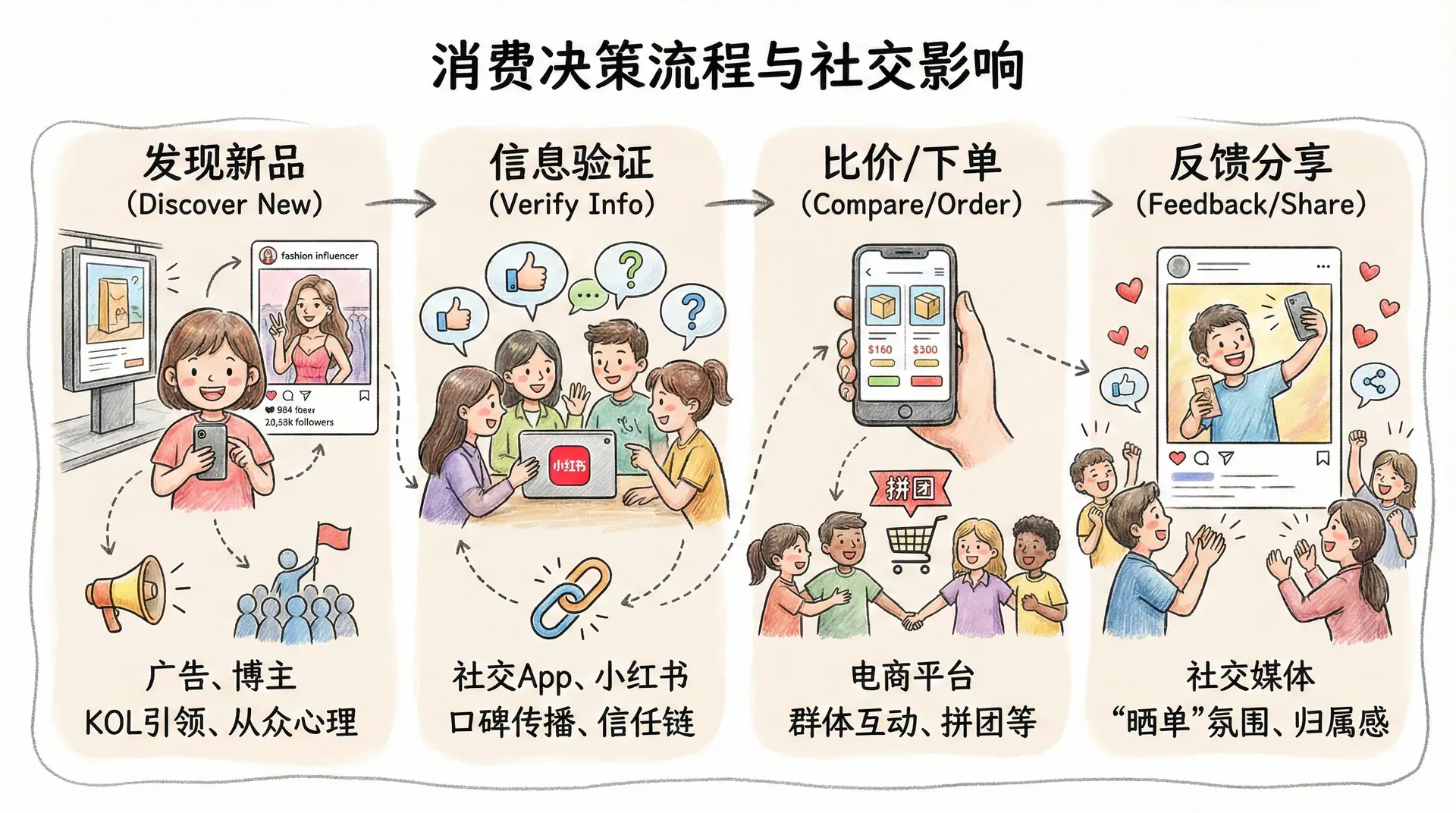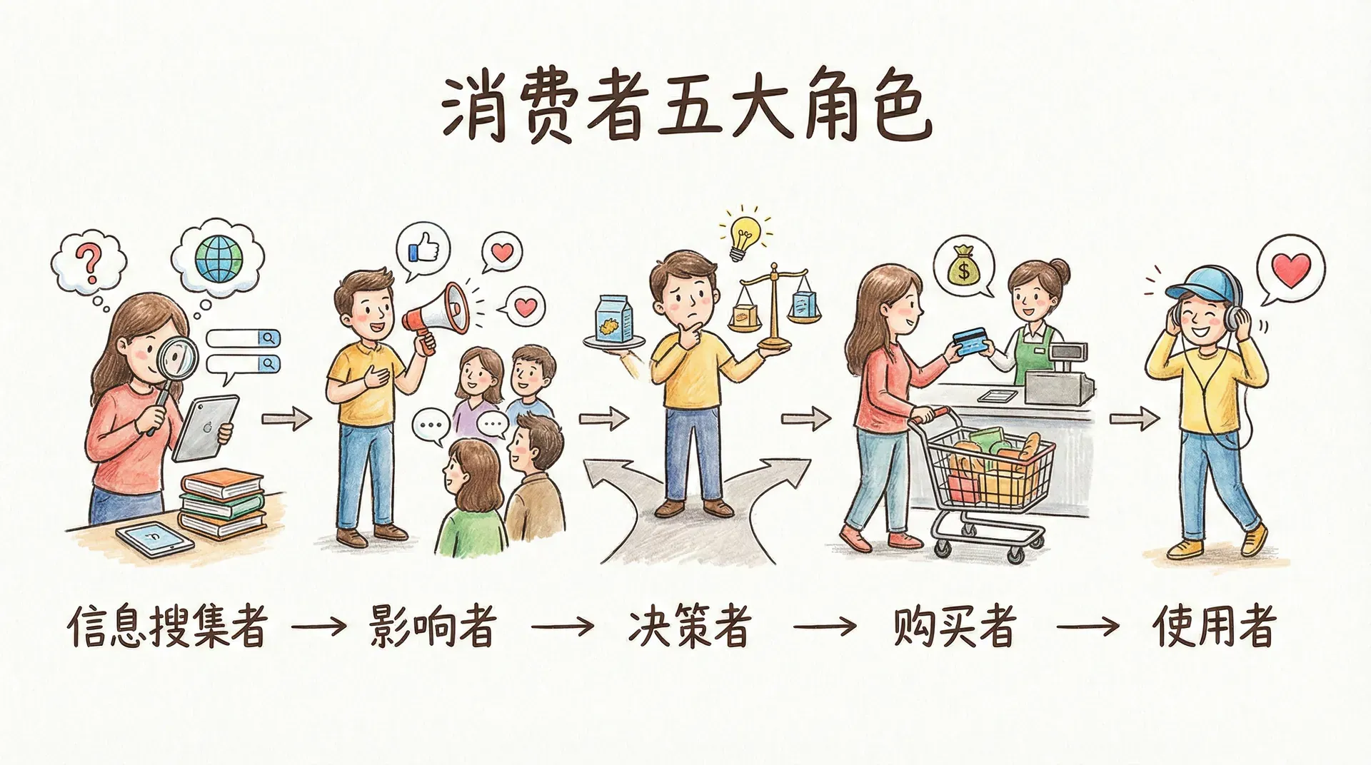 消费者角色通常可分为五类:信息搜集者、影响者、决策者、购买者与使用者。在简单的自我消费场景,这些角色可由同一人承担;但在复杂如家庭、企业等多成员决策场景下,角色分工尤为显著,角色间的互动也更为复杂。