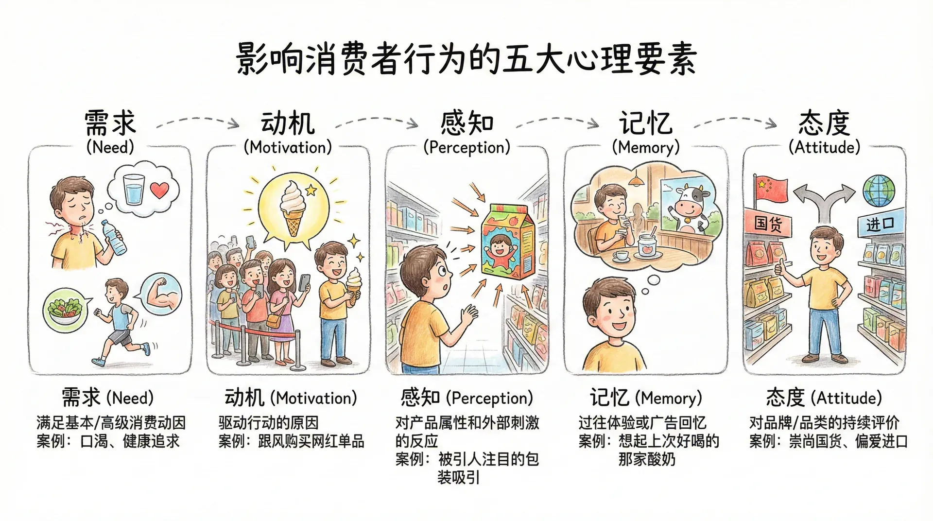个体心理维度强调消费者内在心理过程的作用,包括需求、动机、感知、学习、记忆、态度等。以中国年轻消费者为例:一位大学生在午休时刷外卖平台,原本只是饿了想点快餐,但在美团App弹窗看到“低脂·健康·果饮抢购”,他想到近期健身风潮,结合自己的健康态度和平台评价,最终选购了低糖酸奶。这一过程涉及到从需求(饥饿)、动机(想健康饮食)、感知(被广告/包装吸引)、认知(回想评价信息)、判断到最后决策的心理链条。