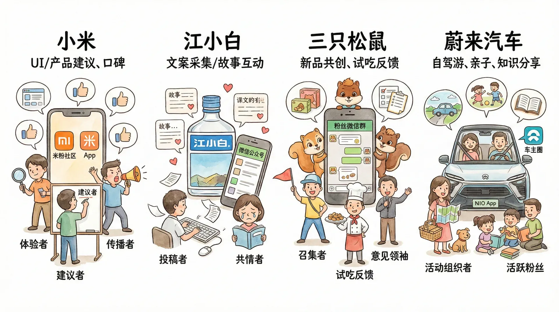 江小白酒瓶的文案常常来自用户投稿,“我的青春小酒”让受众把自己的故事写进产品;三只松鼠则通过新品尝鲜官计划广泛收集消费者建议,共同完善产品。