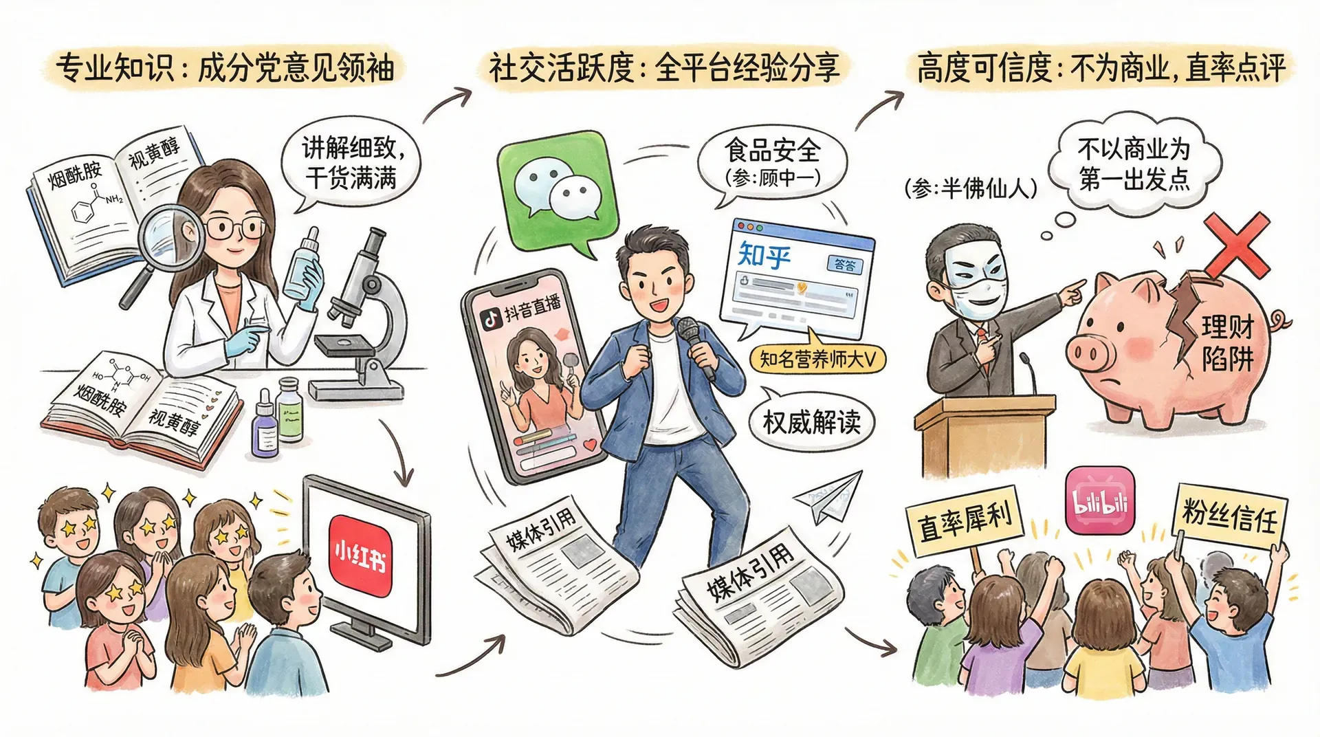 互联网和社交媒体的发展带来了新一代的意见领袖——网络意见领袖(KOL,Key Opinion Leader)。与传统行业内的专家、社区活跃分子相比,KOL的影响力以广泛的粉丝覆盖和极强的话题制造能力为显著特征,且商业化程度更高。举例来说,KOL可以是抖音上的新消费达人、小红书的生活方式分享博主、B站的科技UP主,也可以是美妆测评、家居种草、母婴育儿等垂直领域的专家型内容创作者。