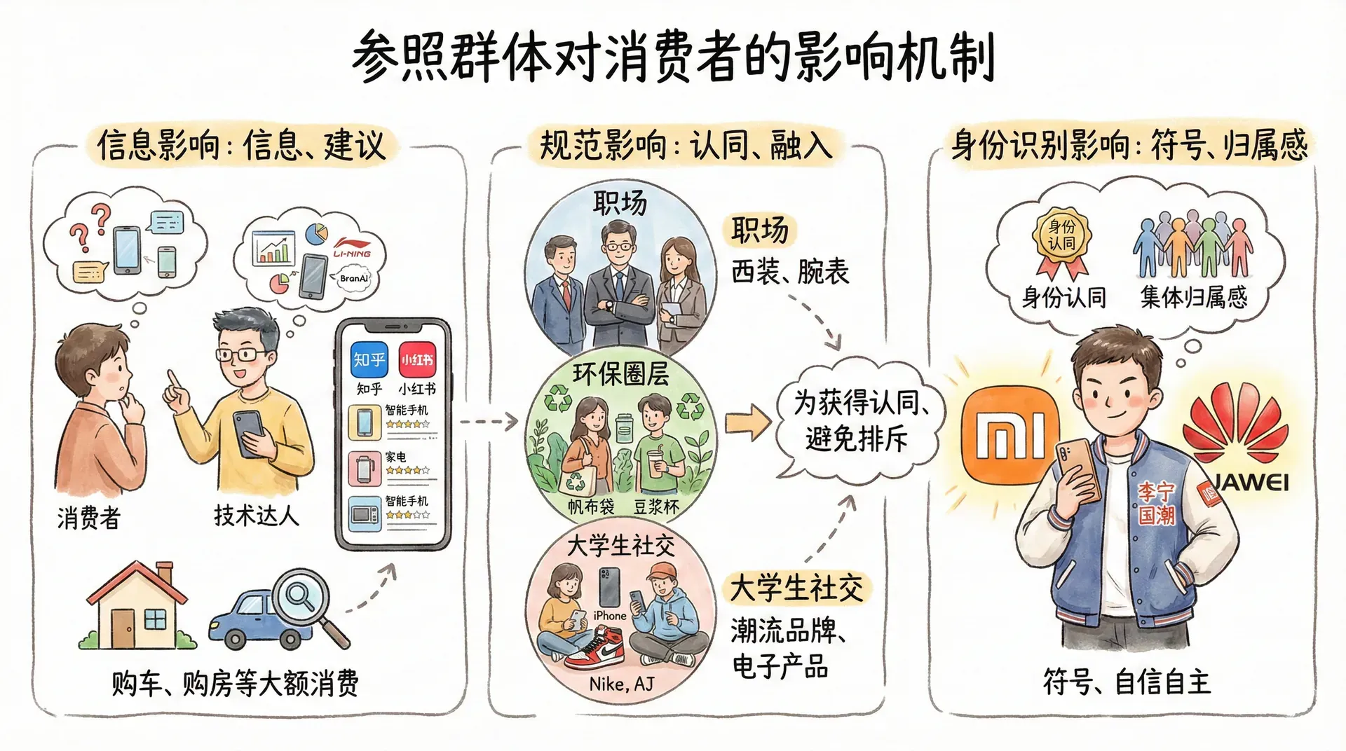 虚拟社群/兴趣圈层:基于互联网的新兴参照群体,例如微信群、豆瓣小组、B站兴趣区等。虽未必有现实世界接触,但在产品测评、游戏、二次元文化、美妆等领域具有强烈影响,甚至能推动小众品牌的流行,如小红书上的“全员种草”带火新消费品类。
