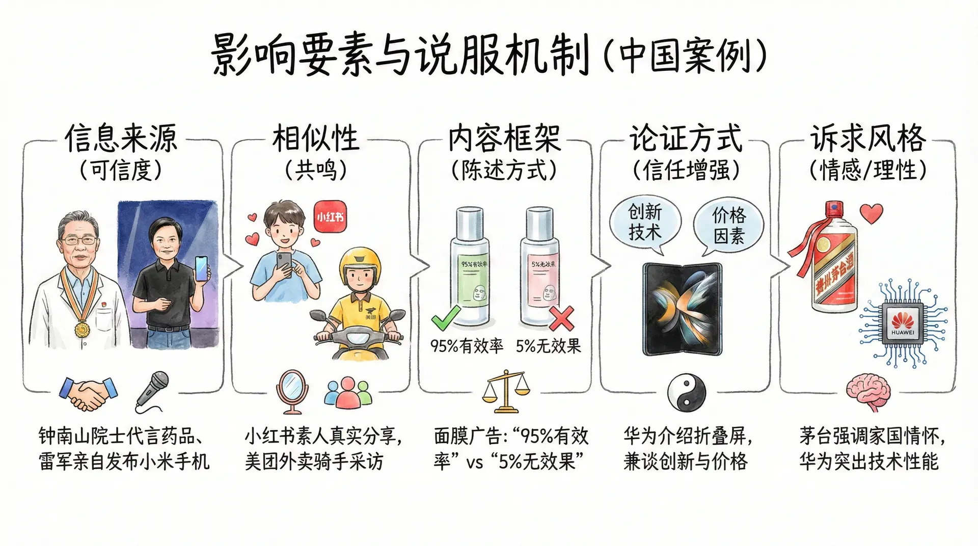 下表简要总结了影响说服效果的主要要素和典型中国案例: