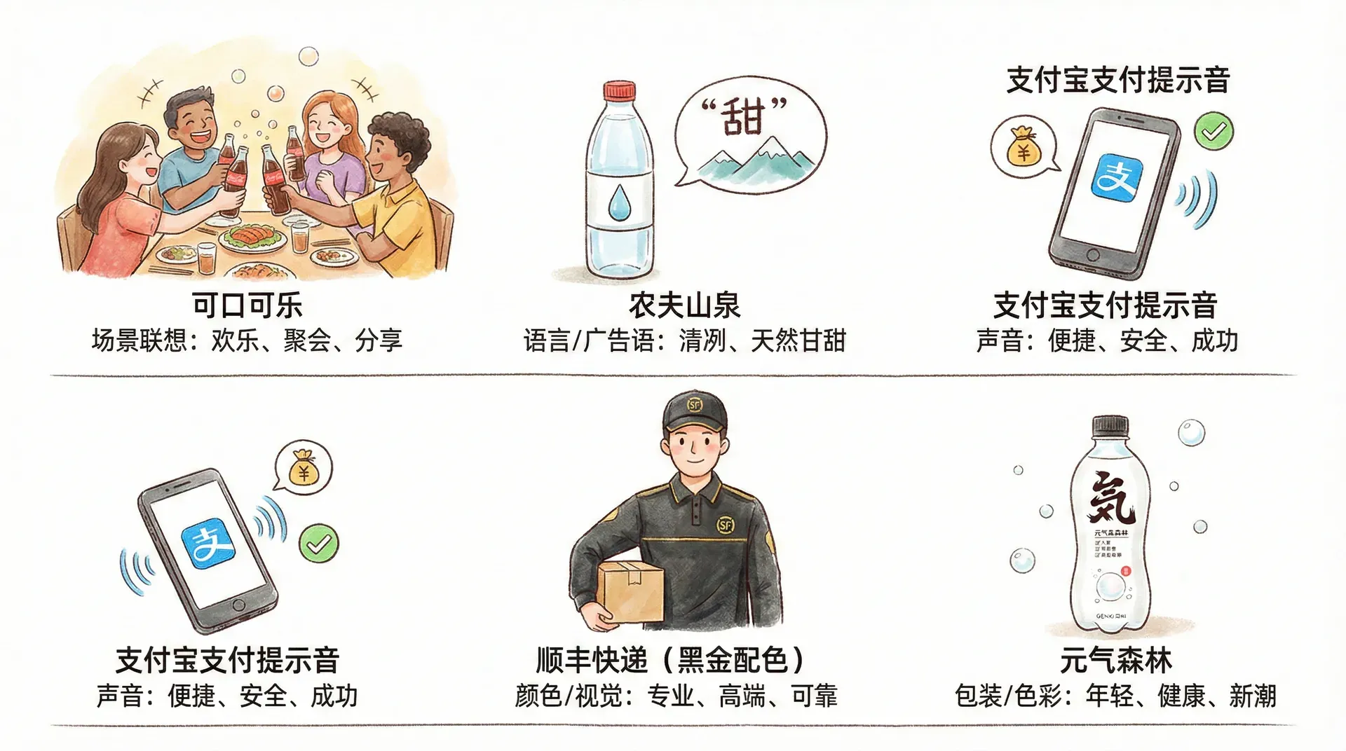 除了语言和画面,声音与颜色也是强有力的品牌联想载体。例如: