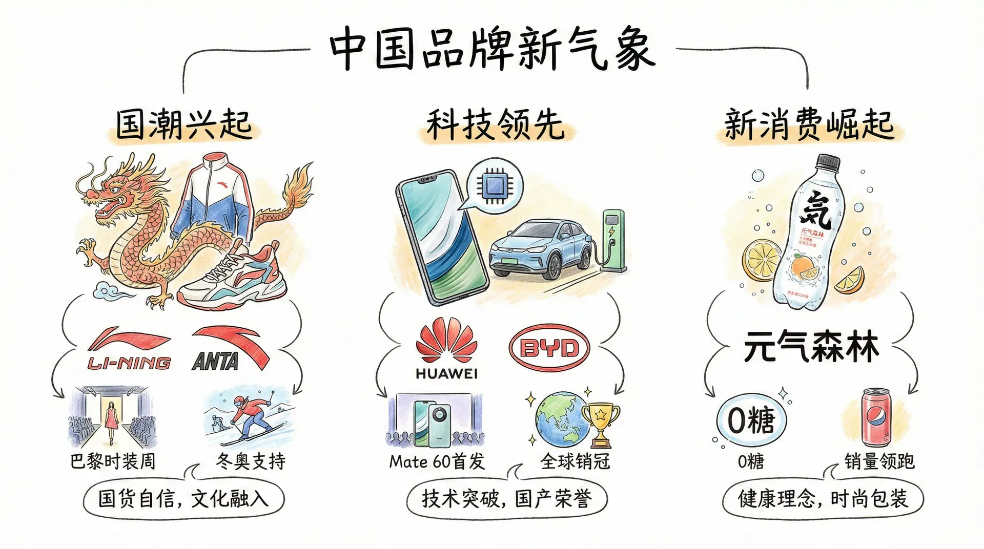 过去,“外国的月亮比较圆”是主流看法,进口品牌享有天然声誉优势。但近年来,国产品牌的形象跃迁尤为显著。例如,华为、小米、比亚迪、李宁、名创优品等本土品牌不断获得年轻人青睐,"国潮"成为一种热门文化趋势。消费者对国产品牌的认知也发生了转变,从“无奈之选”进阶到“自豪地选择”。以李宁“吾就是中国李宁”品牌重塑为例,不仅收获了年轻群体,更激发了民族消费热情。