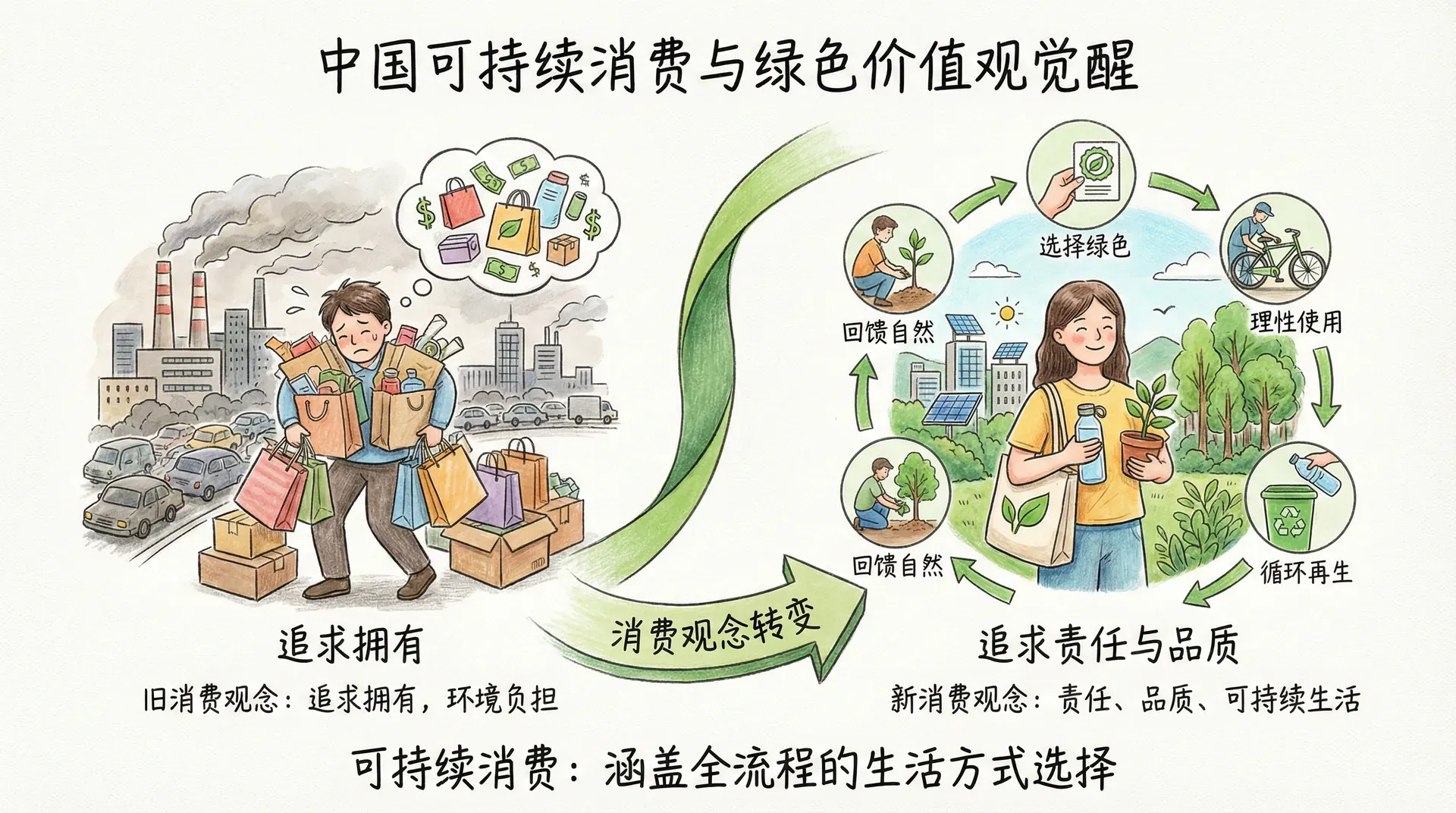 可持续消费不仅局限于购买“绿色”商品,而是一种涵盖消费全流程的生活方式选择。例如,减少不必要的购买、优先选择可持续生产的产品、延长物品使用寿命、循环再利用以及妥善处理废弃物等,都是可持续消费的重要表现。