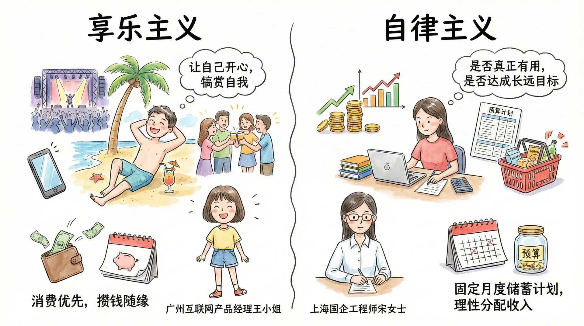 例如,广州互联网产品经理王小姐秉持享乐观念,每次发工资都会优先安排演唱会、朋友聚餐、短途旅行活动;而她的朋友——上海工程师宋女士,则有详细的消费预算和储蓄计划,坚持“不为一时感性买单”,所有消费都事先列清单、权衡利弊。