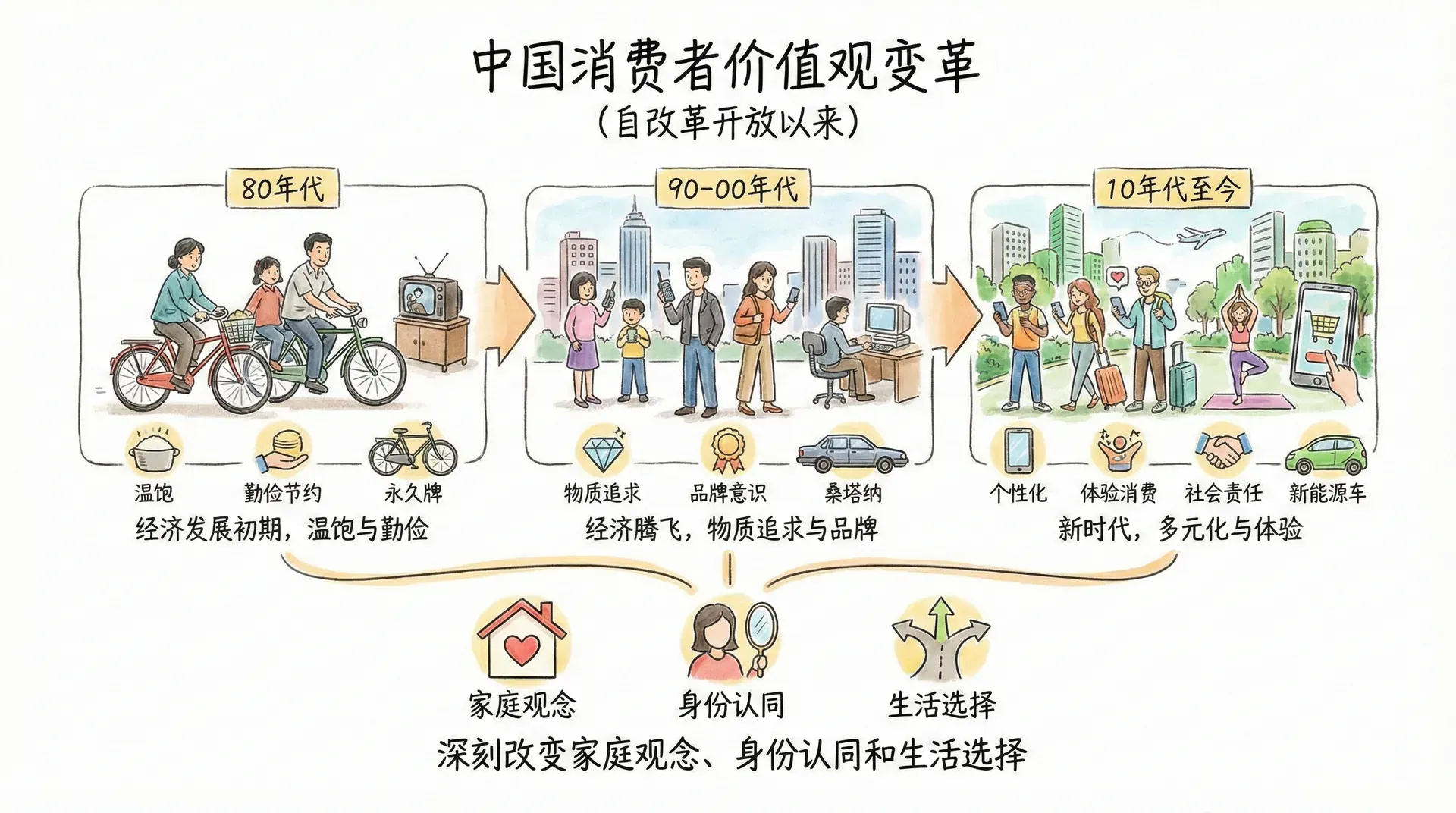 自改革开放以来,中国消费者的价值观历经数次深刻变革,这些变迁深刻映射了国家经济发展与社会文化的转型。价值观的更新不仅影响人们的消费方式,也深刻改变了家庭观念、身份认同和生活选择。
