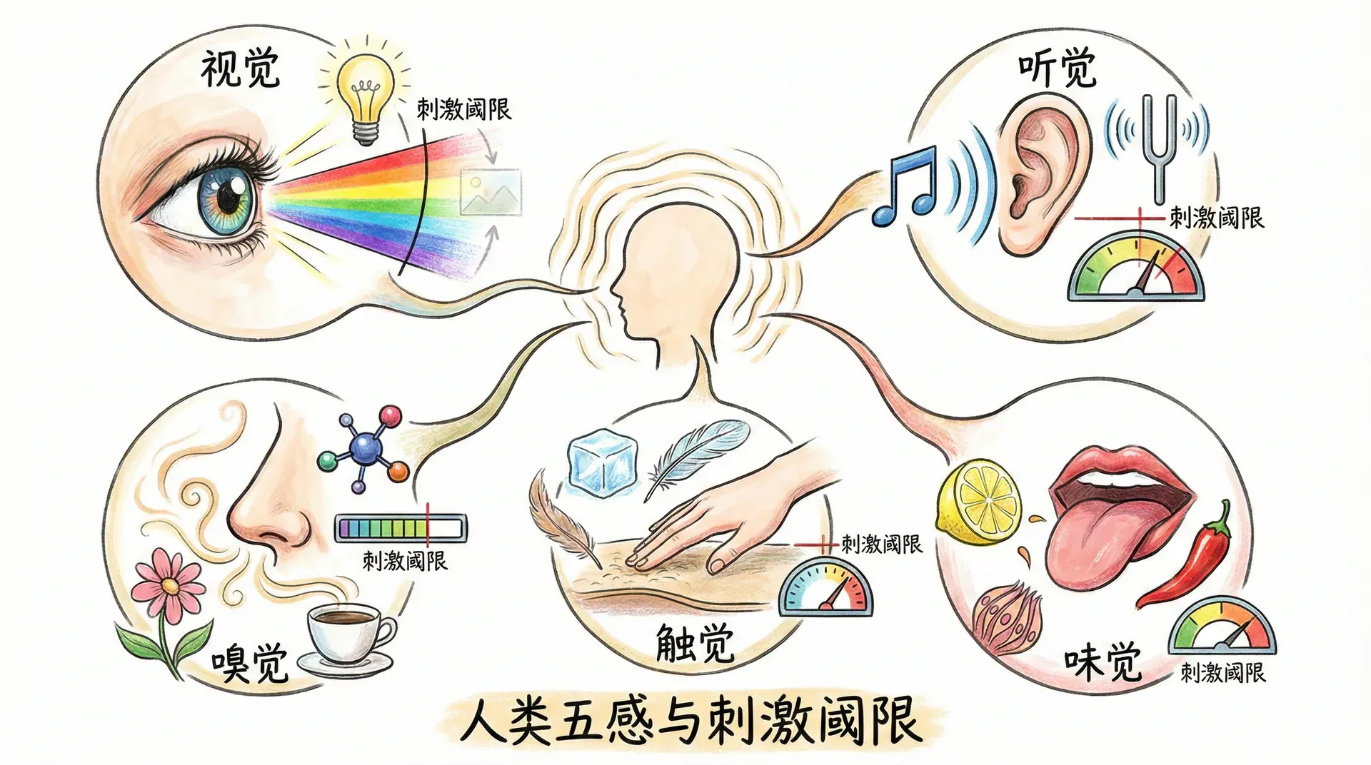 人类通过五种基本感觉系统接收外界信息:视觉、听觉、嗅觉、触觉和味觉。每种感觉都对应着特定的刺激阈限,当外界刺激达到或超过这个阈限时,人们才能感知到它的存在。