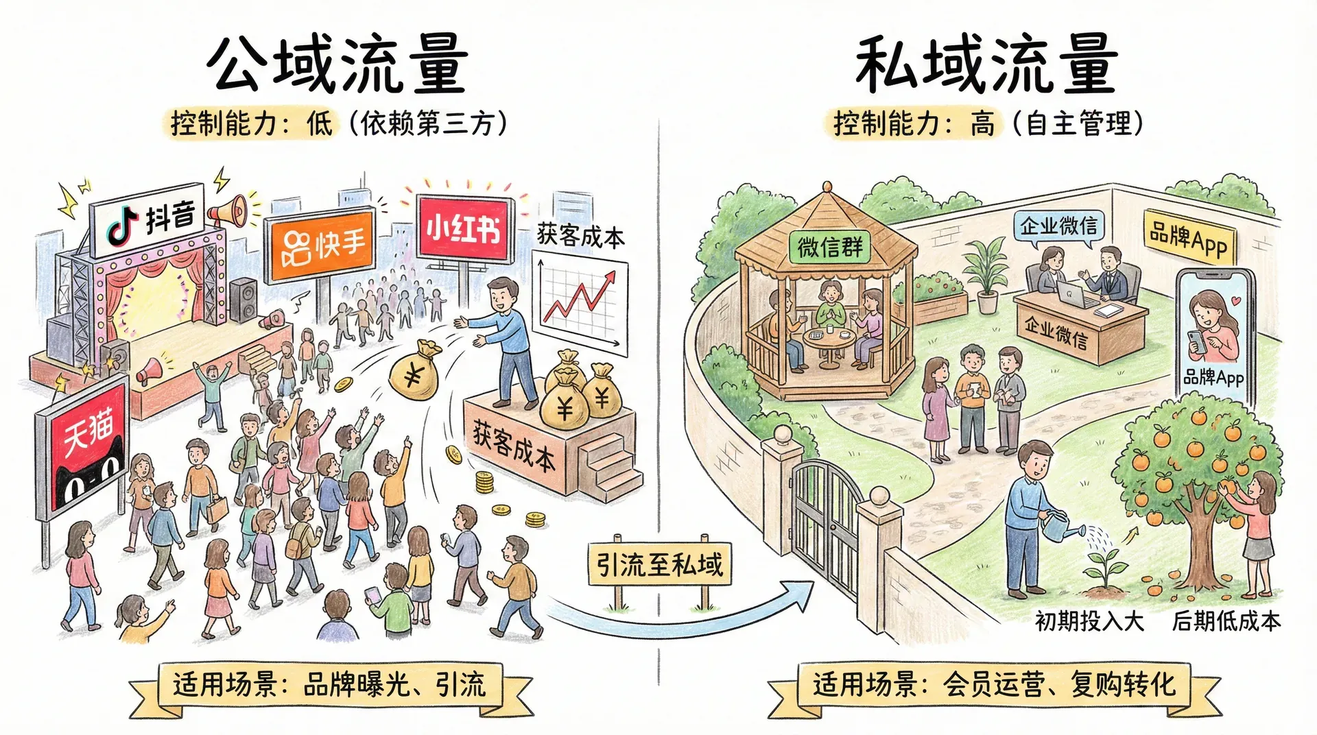 进一步来看,私域与公域流量各有特点: