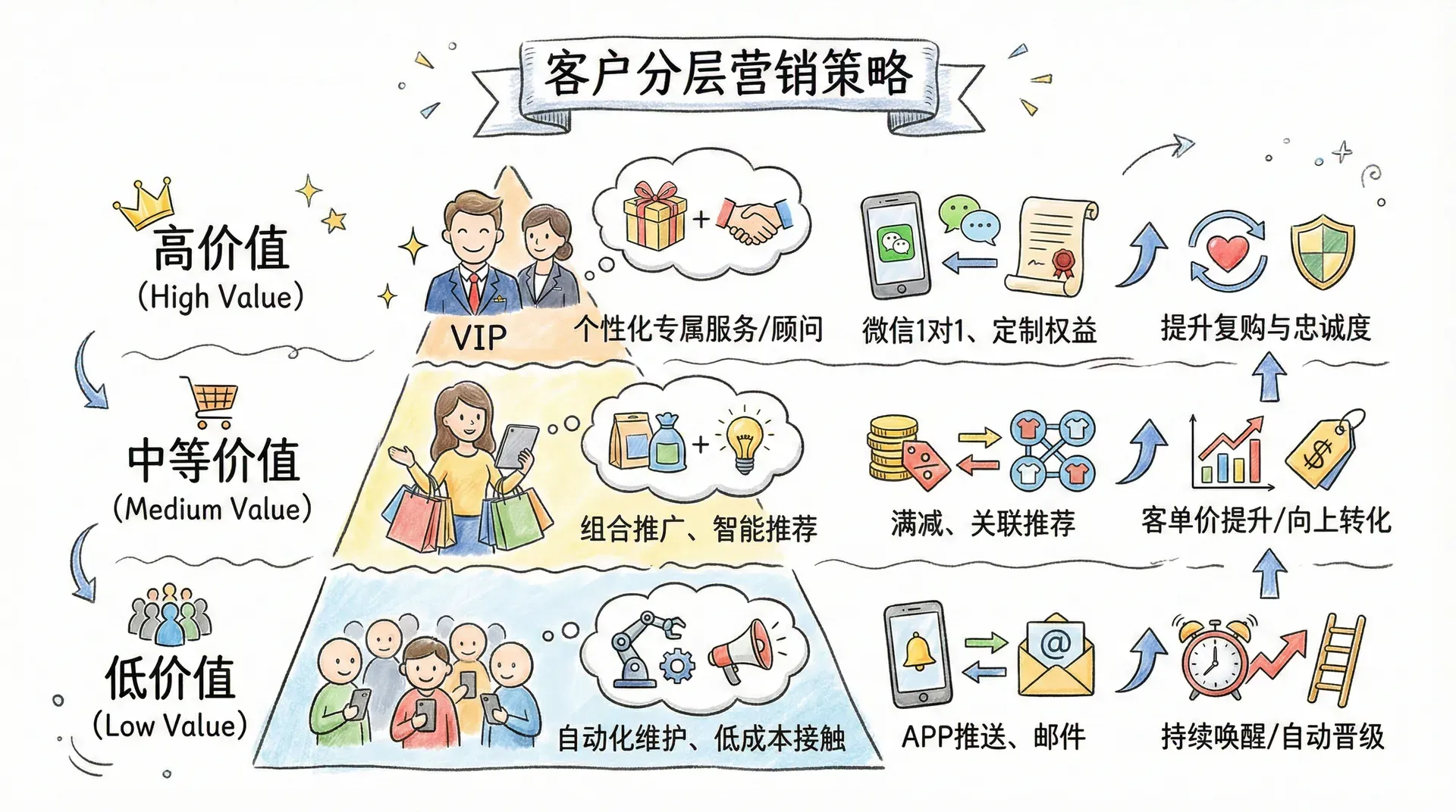 客户价值得分后,企业应根据层级差异制定个性化服务策略,以提升客户转化与粘性: