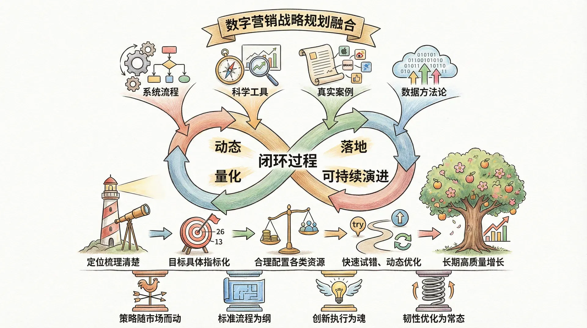 数字营销战略规划融合了系统流程、科学工具、真实案例与数据方法论。企业只有真正将定位梳理清楚,把目标具体指标化,合理配置各类资源,才能在激烈的数字市场中快速试错、动态优化,实现长期高质量增长。最后要强调:策略随市场而动,标准流程为纲,创新执行为魂,韧性优化为常态。 真正的优秀数字营销战略,始终是动态、量化、落地、并可持续演进的闭环过程。