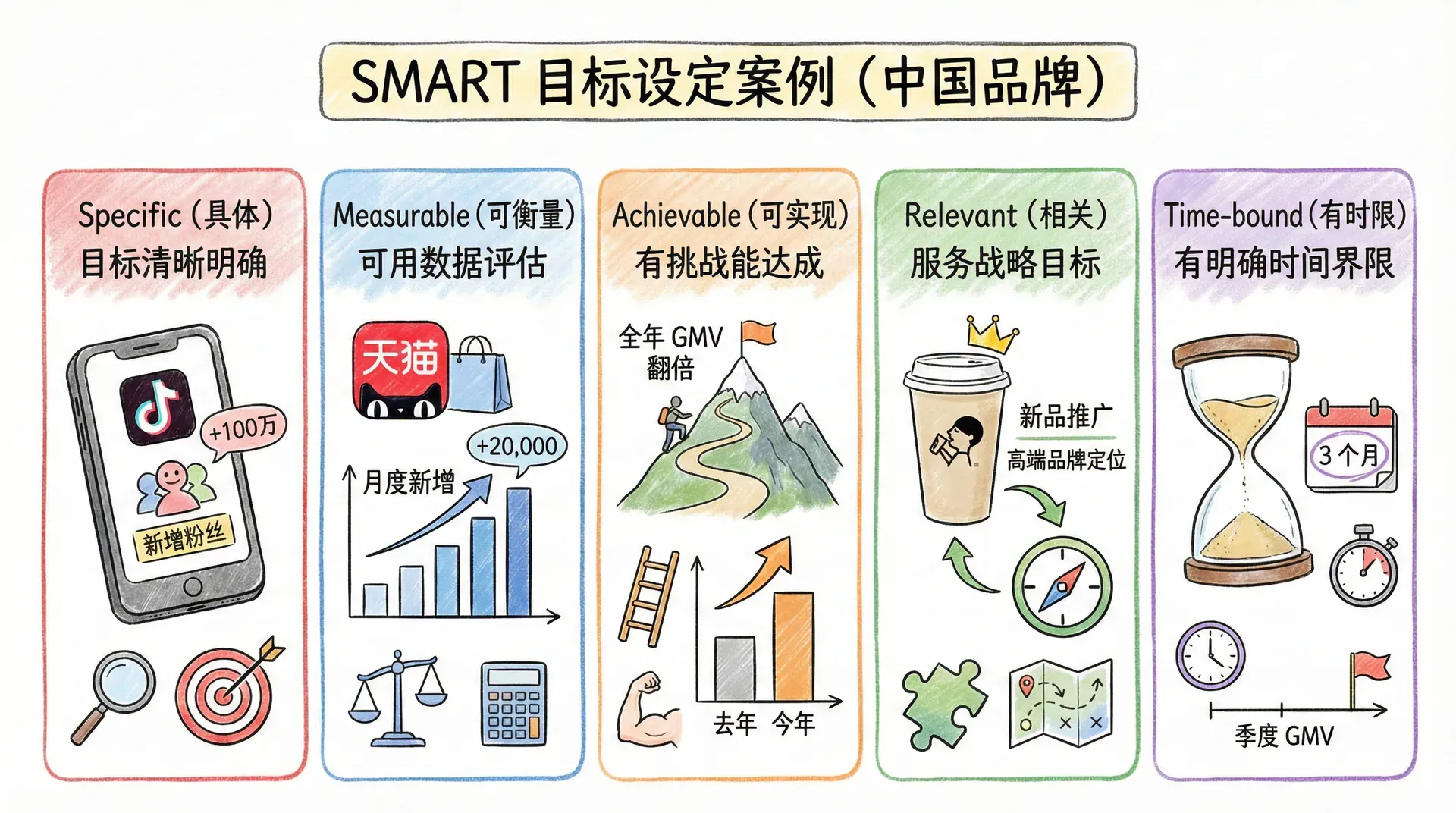 SMART原则是科学有效设定目标的“金标准”。企业营销目标要做到具体(S)、可衡量(M)、可实现(A)、相关(R)、有时限(T),才能具备落地性和激励性。