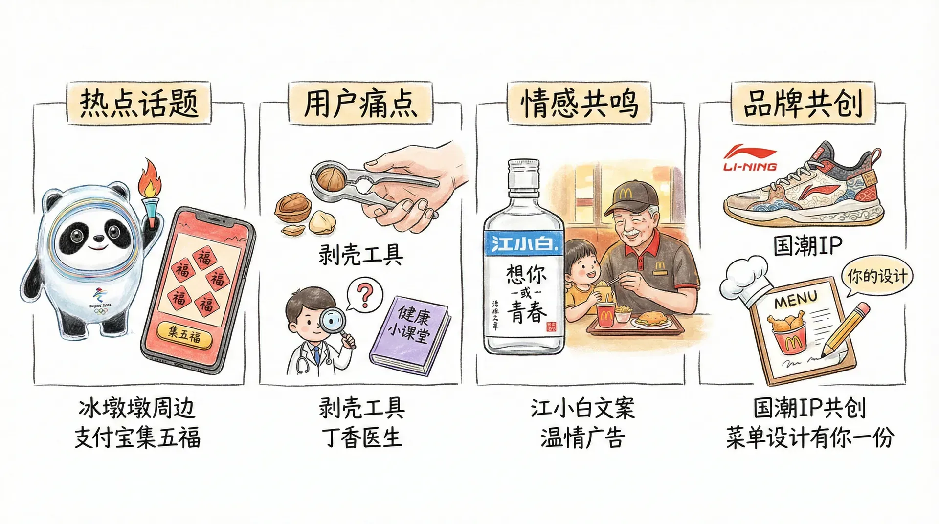 内容创意可主要来源于热点话题、用户痛点和情感共鸣,此外也包括行业趋势观察和品牌自身故事。例如: