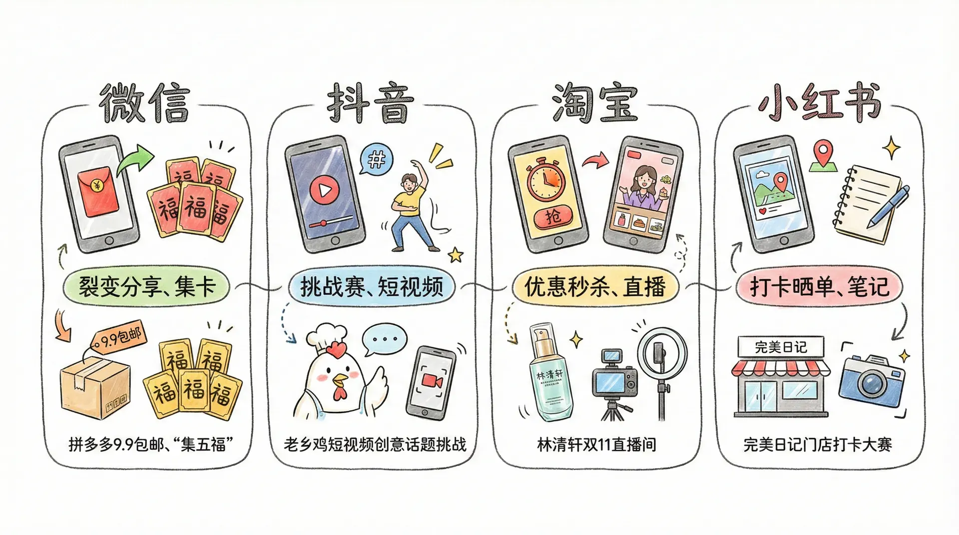 提示:如阿里巴巴集“五福”活动逐步预热,除夕夜迎来高潮。品牌应根据节点重要性,合理配置预热、爆发、返场等阶段的宣发资源。