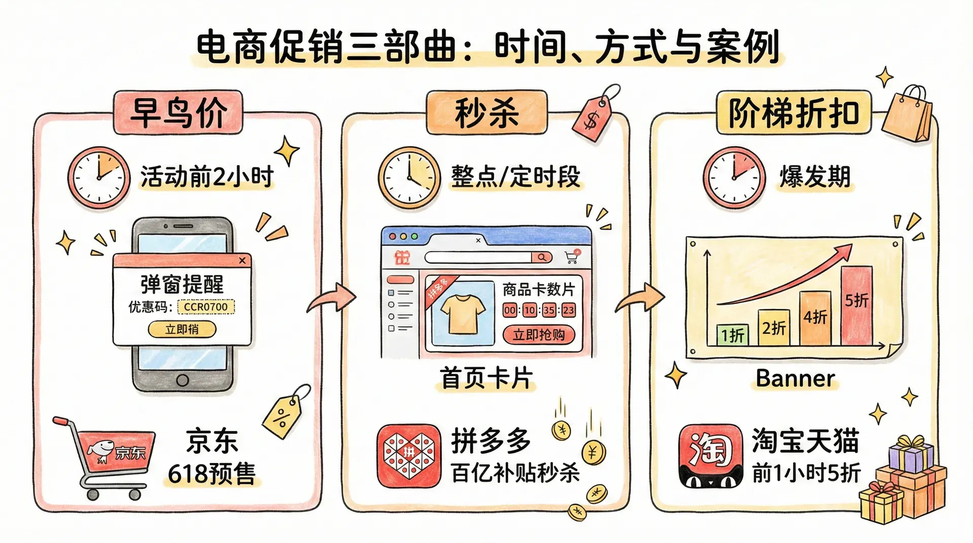 限时折扣通过时间限定营造紧迫感,显著刺激用户下单。例如,京东618、淘宝“双十一”电商节往往在零点开启“前一小时大促”,如“全场前30分钟5折”,吸引海量用户抢购。拼多多“限时秒杀”则常常以低于市场价的方式限量售卖清库存,提升访问量并带动其他品类成交。