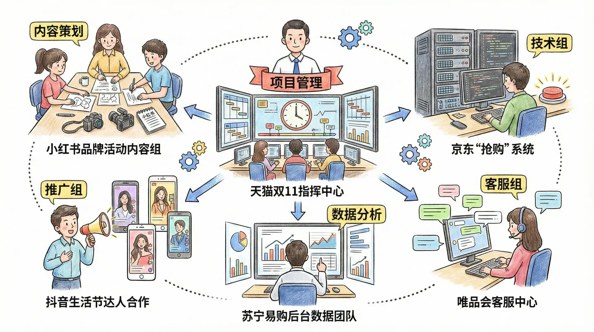 大型整合营销活动通常包含项目管理、内容策划、渠道推广、技术开发、客户服务、数据分析等多个岗位协作。例如,抖音“DOU生活节”与天猫“双11”项目,分别组建专门的多岗位团队,强调跨部门、高频沟通。