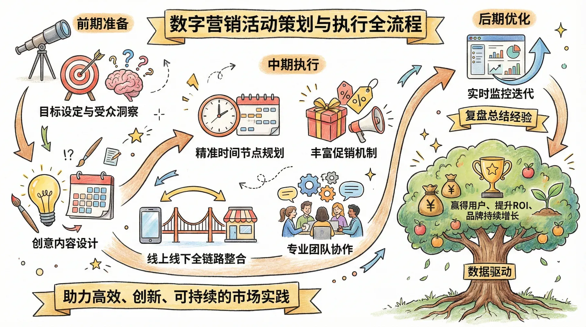 数字营销活动策划是一项系统化工程,涵盖目标设定、受众分析、创意主题、资源规划、方案撰写等多环节,科学的流程不仅能明确策略方向,还能保障活动顺利落地并实现预期效果。下表概览一般数字营销活动的关键步骤:
