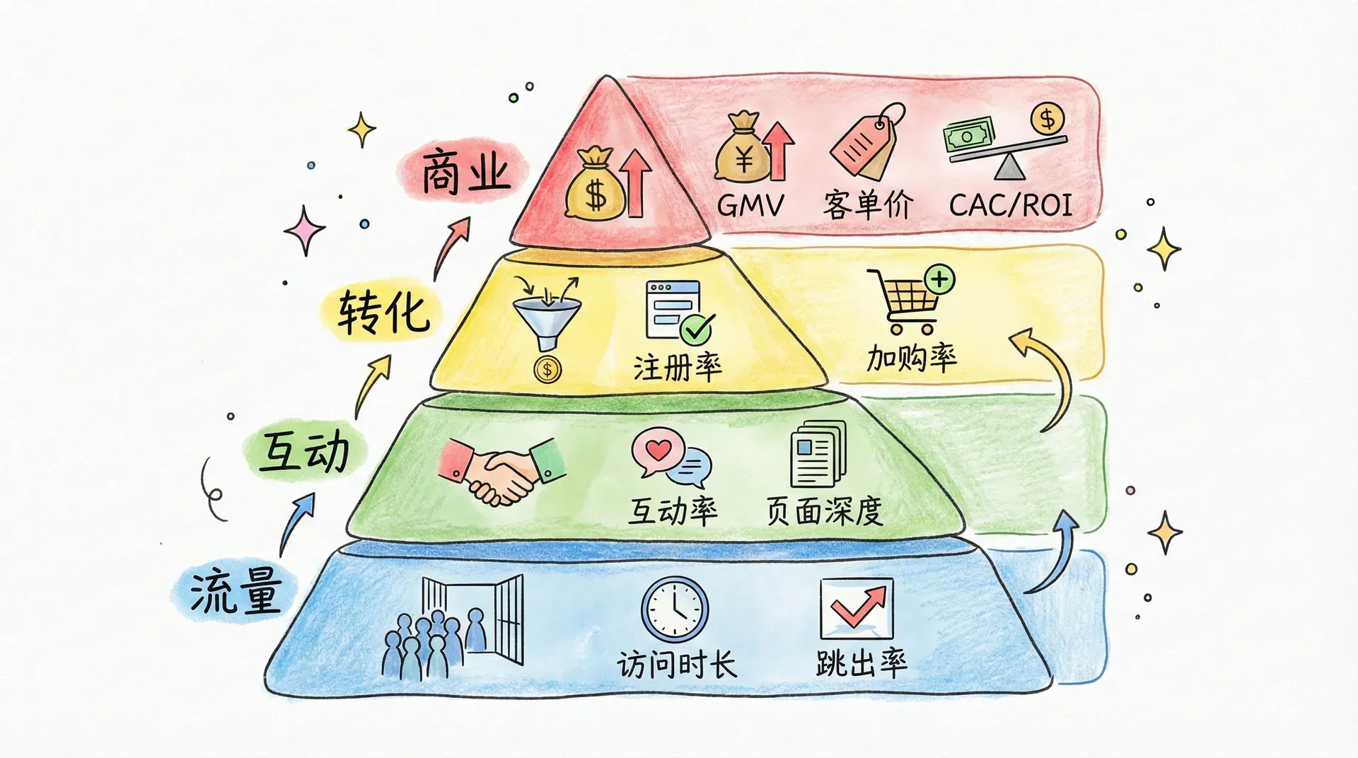 商业指标:如GMV(成交总额)、CAC(获客成本)、ROI(投资回报率)等。