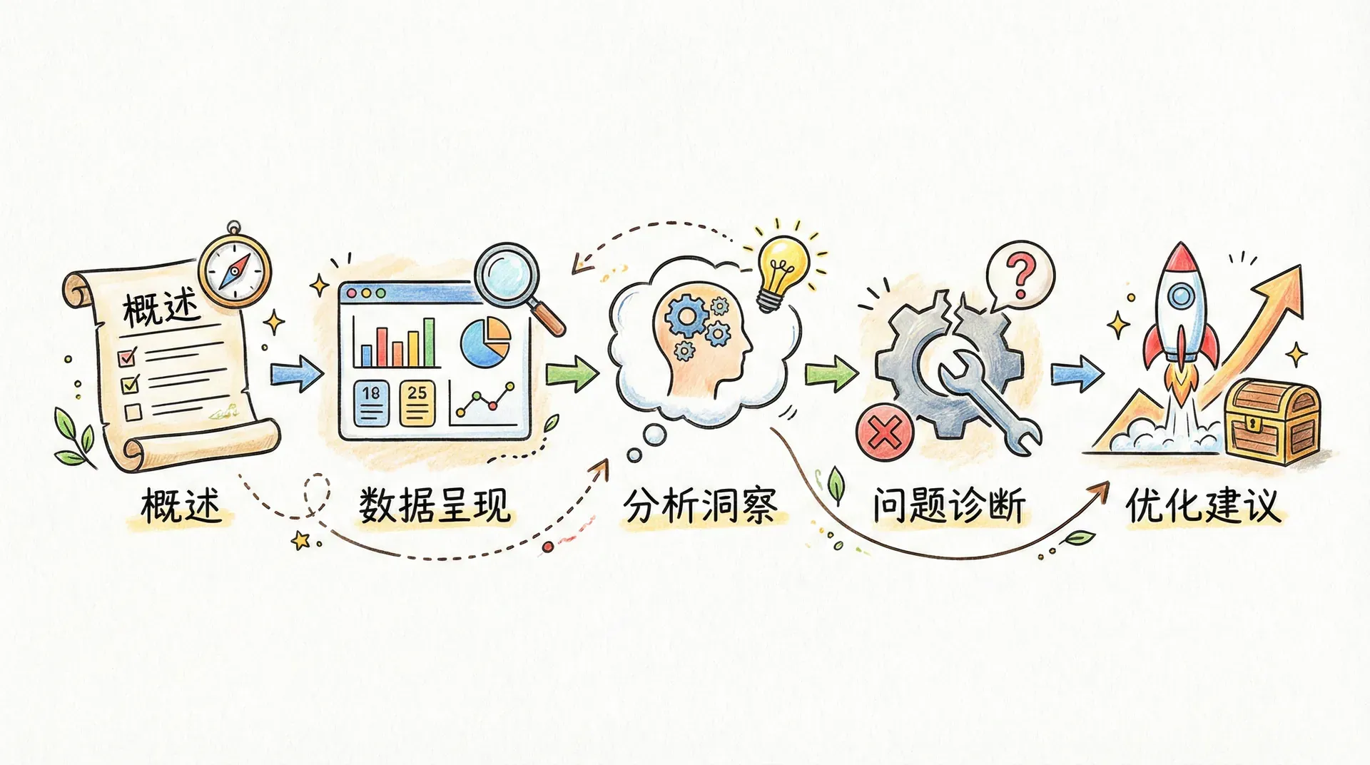 一份完整的营销效果报告通常包括五个部分:概述、数据呈现、分析洞察、问题诊断、优化建议。每个部分都应有针对性地安排内容和表现方式。