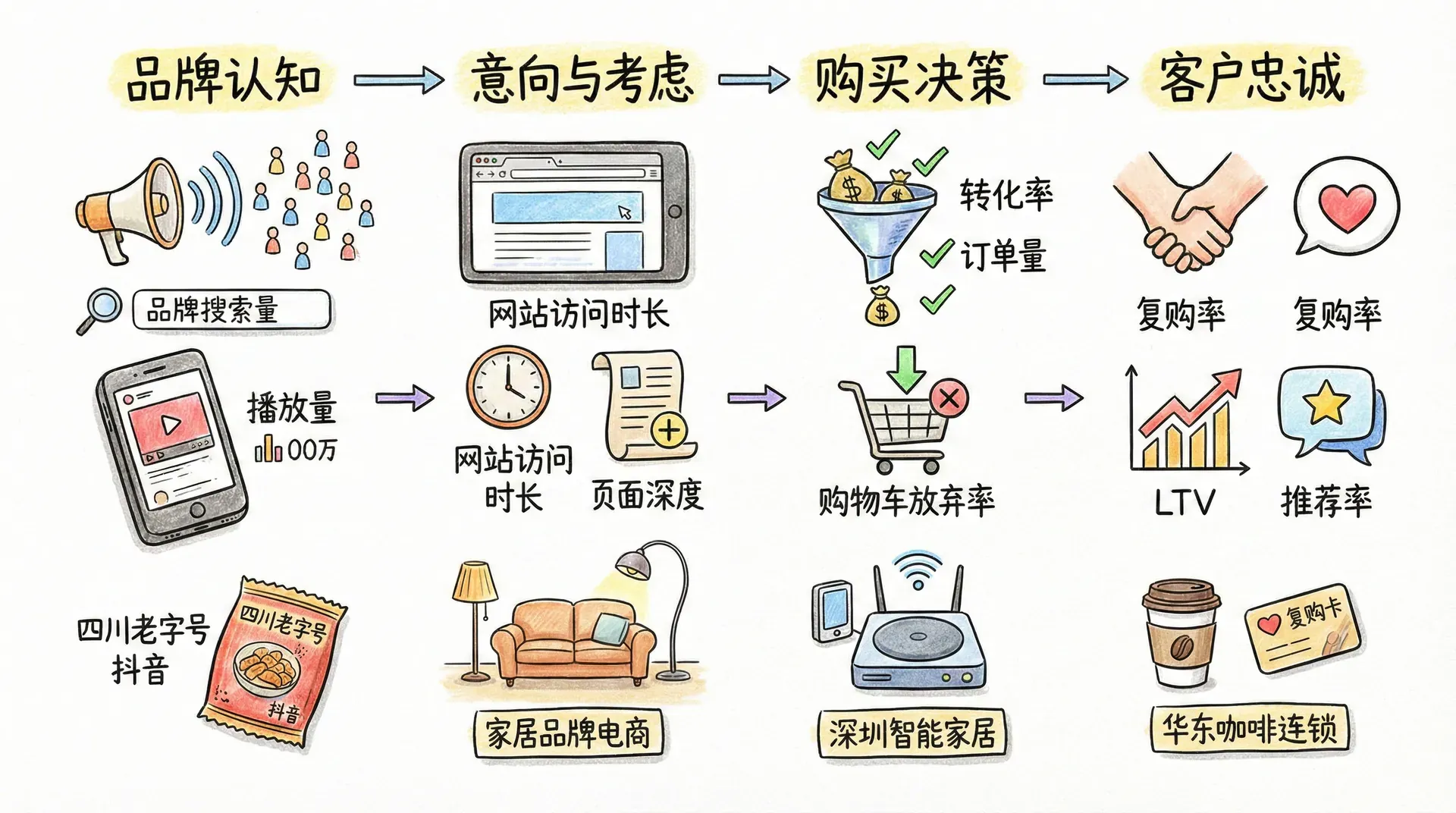 例如,一家本地茶饮品牌在品牌阶段重点提升曝光和播放量,后续成熟期则关注转化率和复购率。