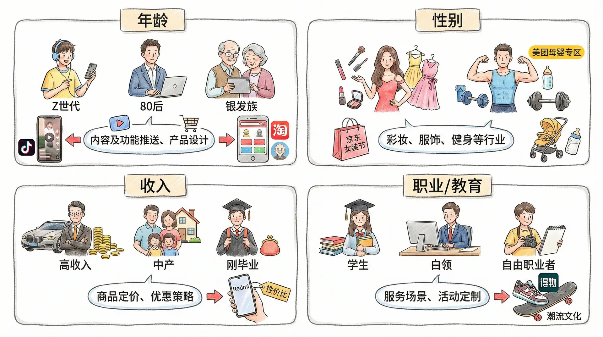 人口统计变量是市场细分最经典的手法,尤其适合大众消费品和主流平台。中国线上市场人口细分常用变量如下: