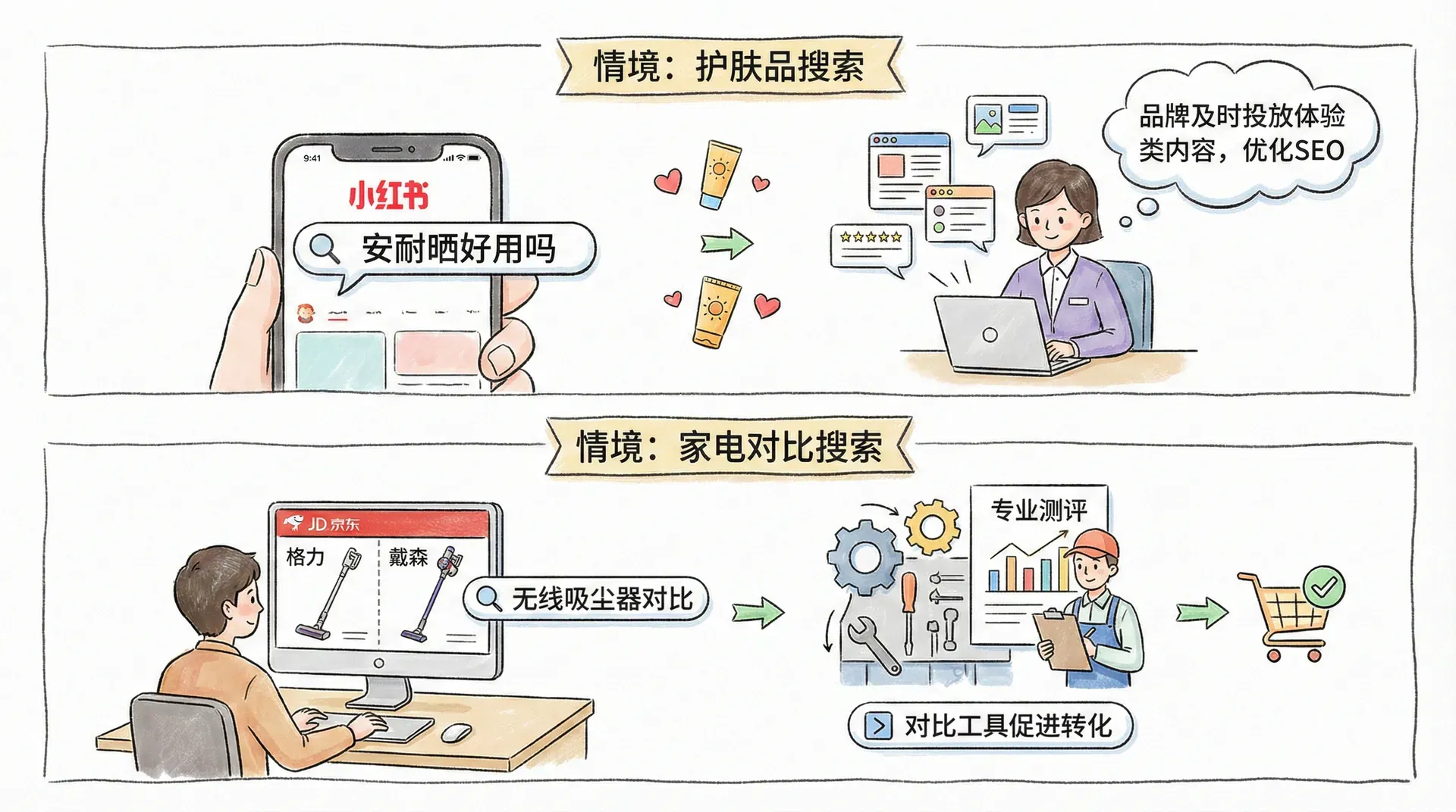 搜索是在线消费行为的起点。绝大多数中国网民在购买前都会主动搜索产品特性、价格、评价与推荐。主流搜索渠道包含百度、抖音、小红书、淘宝等电商与内容平台。消费者输入的搜索词高度反映其意图。例如,输入“学生党平价护肤品”的用户与搜索“功效型抗衰老精华”的用户,需求、年龄、消费能力明显不同,企业可对搜索词进行标签化,指导产品推荐和广告定向投放。