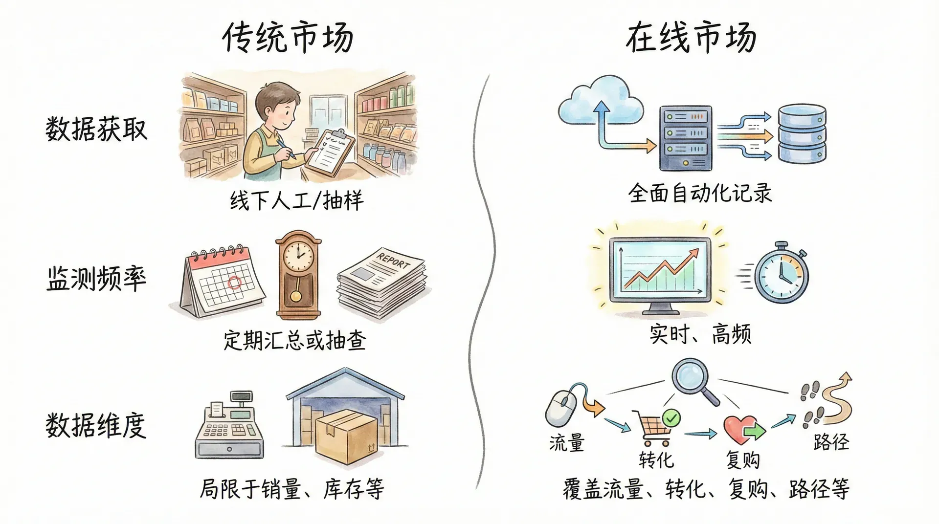 在线市场与传统市场在数据化核心方面主要有如下差异:
