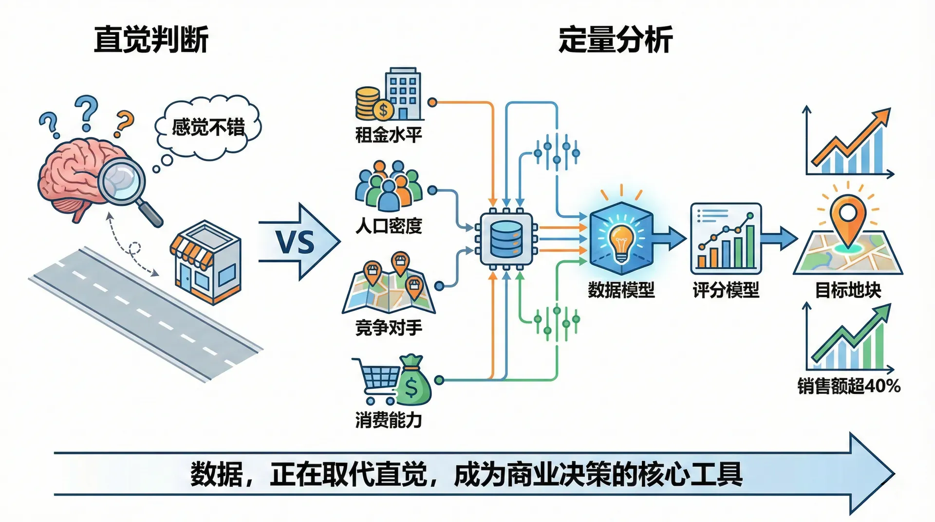 2022年,某连锁便利店品牌在华北地区开设了第200家门店。选址团队在拍板之前,并不是简单地"感觉这条街人流量不错",而是调取了周边3公里内的人口密度、竞争对手数量、租金水平、目标客群消费能力等多维数据,建立了一套评分模型,最终才锁定了目标地块。这家门店开业首月销售额超过同期平均水平40%。数据,正在取代直觉,成为商业决策的核心工具。