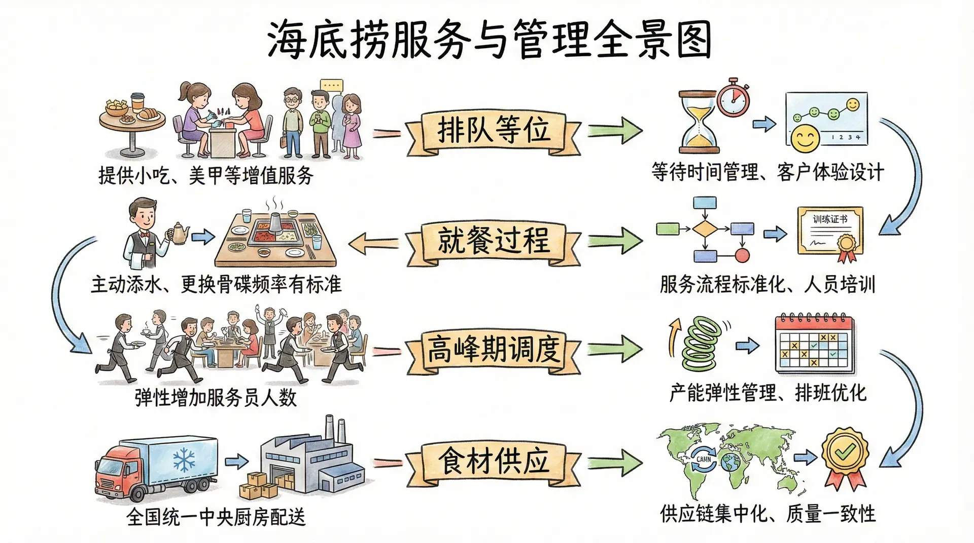 海底捞的成功,常被归因于"服务好"。但从运营管理的角度看,这背后是一套精心设计的服务流程体系。