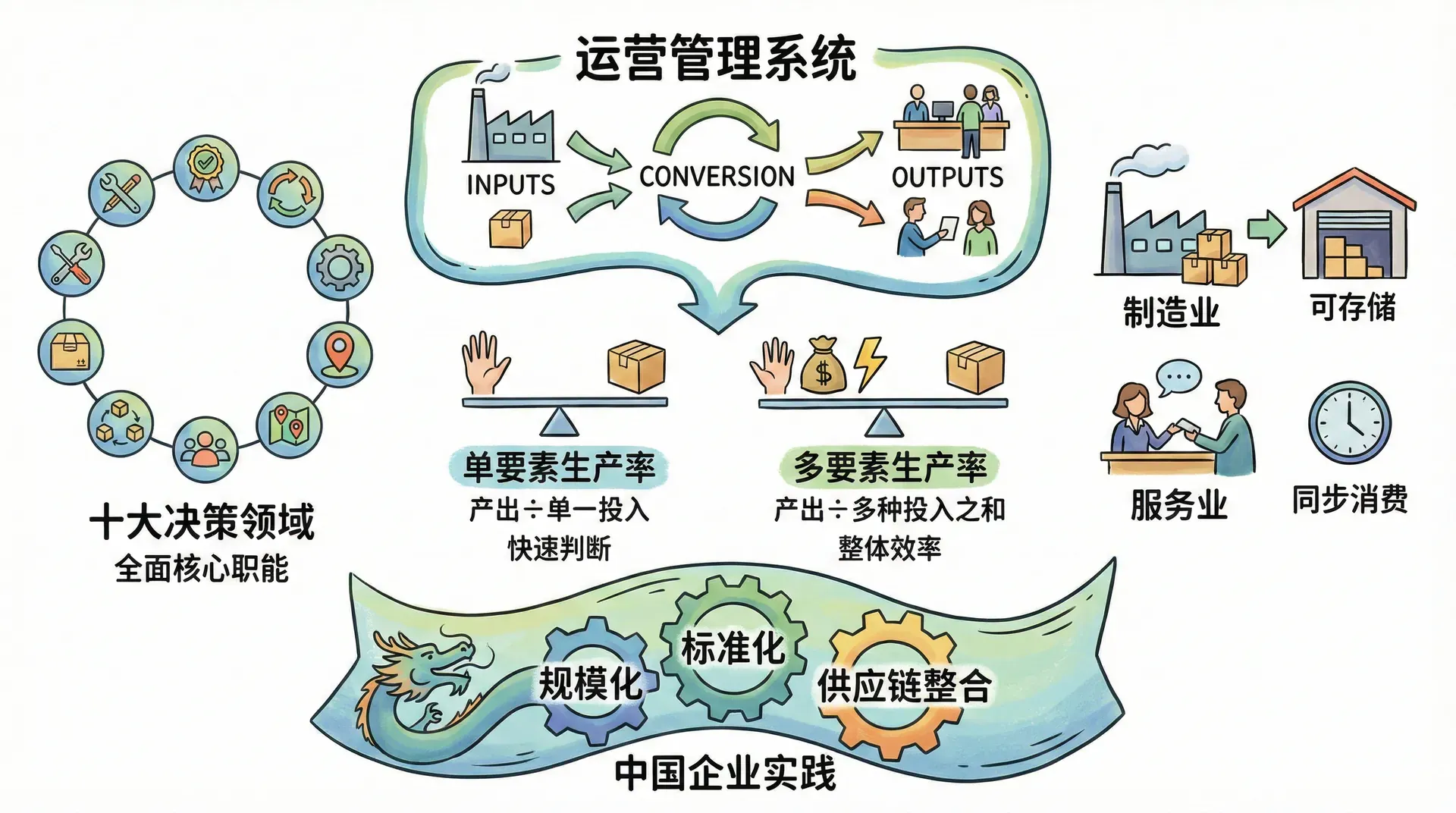 这十个领域并不是孤立的,它们相互影响。选址决策影响供应链的成本;产能大小影响排程的灵活性;质量管理的水平直接影响维护工作的频次。理解这种相互关联,是学好运营管理的关键。