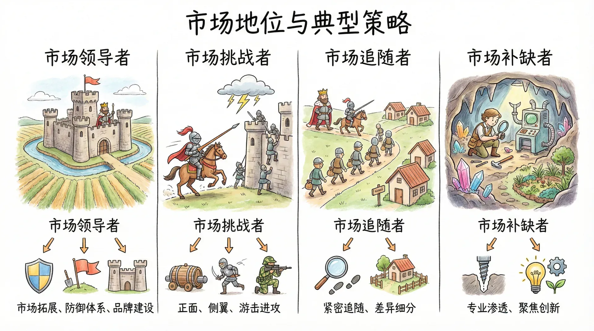 在任何一个行业中,企业会根据其市场份额()和资源能力被划分为不同的市场地位,主要包括市场领导者、市场挑战者、市场追随者和市场补缺者。每种市场地位的企业需要根据自身所处的位置制定有针对性的竞争策略,以应对市场环境的变化和竞争压力。