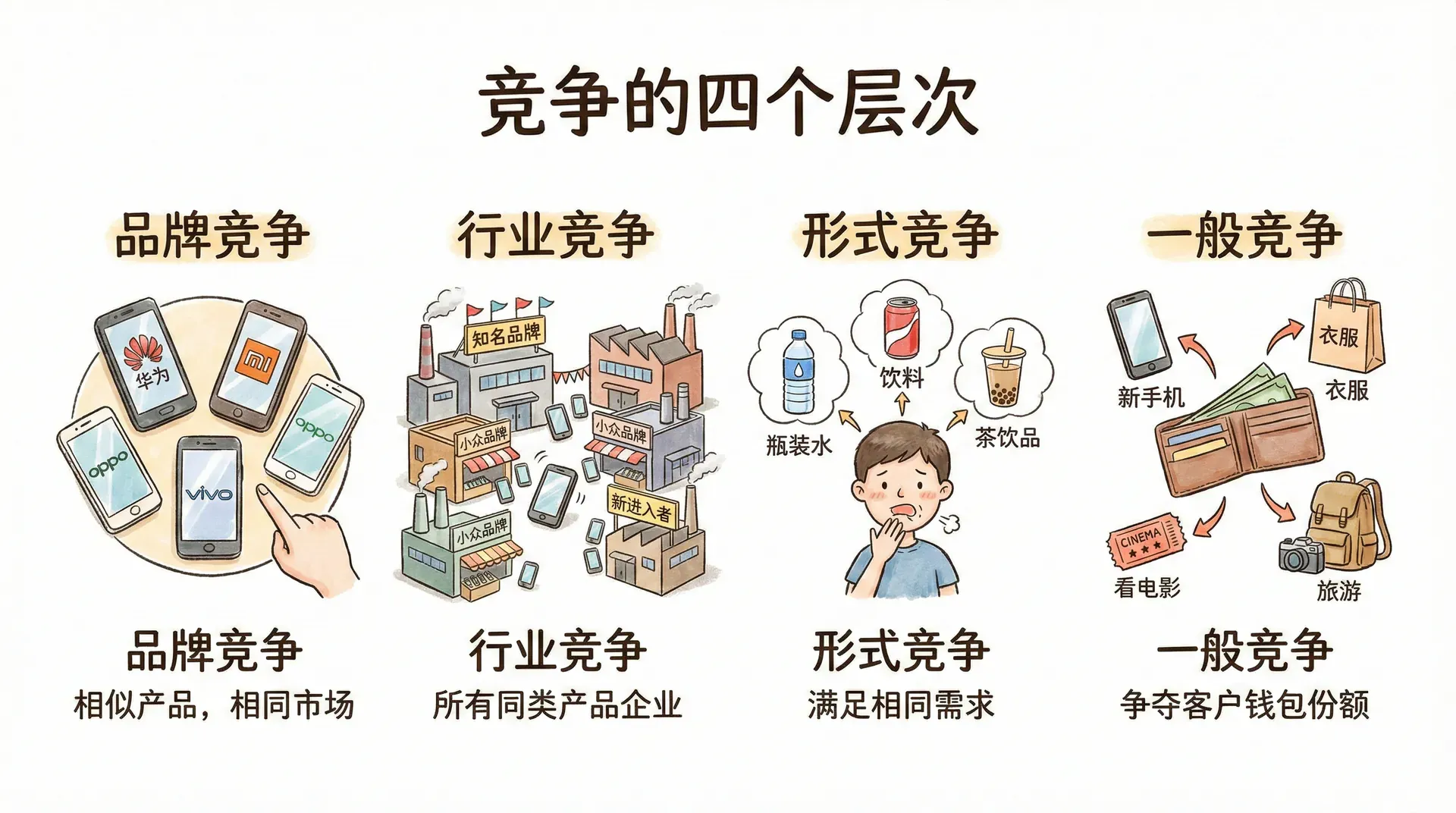 从行业的角度来看,竞争者可以分为四个层次。下面用Markdown表格对这四个层次进行总结: