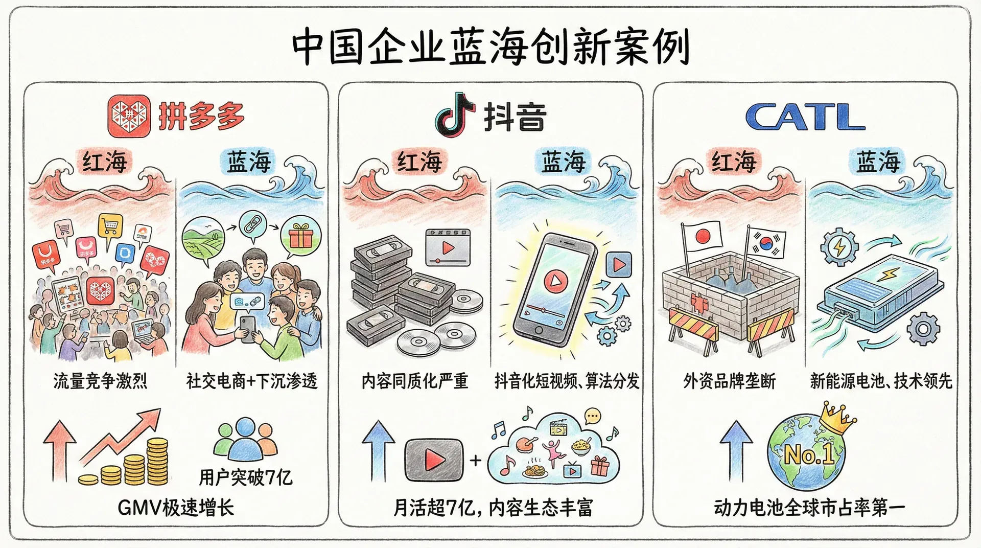 传统竞争战略的核心在于“如何在有限的市场资源下战胜对手”,聚焦于红海市场的份额争夺。而蓝海战略则强调:与其在红海“厮杀”,不如创新、升级或重新定义产业,主动开创新的市场空间,将竞争暂时抛在身后。