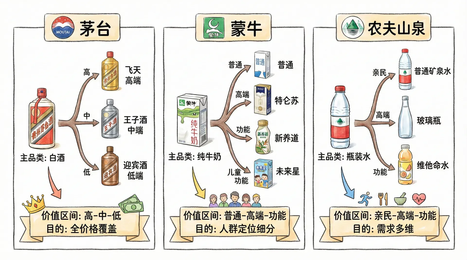 贵州茅台通过“飞天茅台”、“茅台王子酒”、“茅台迎宾酒”等,组成高、中、低不同价格带,既维护高端形象,又覆盖大众市场。王子酒、迎宾酒以“茅台”品牌背书,满足更广泛消费层需求。